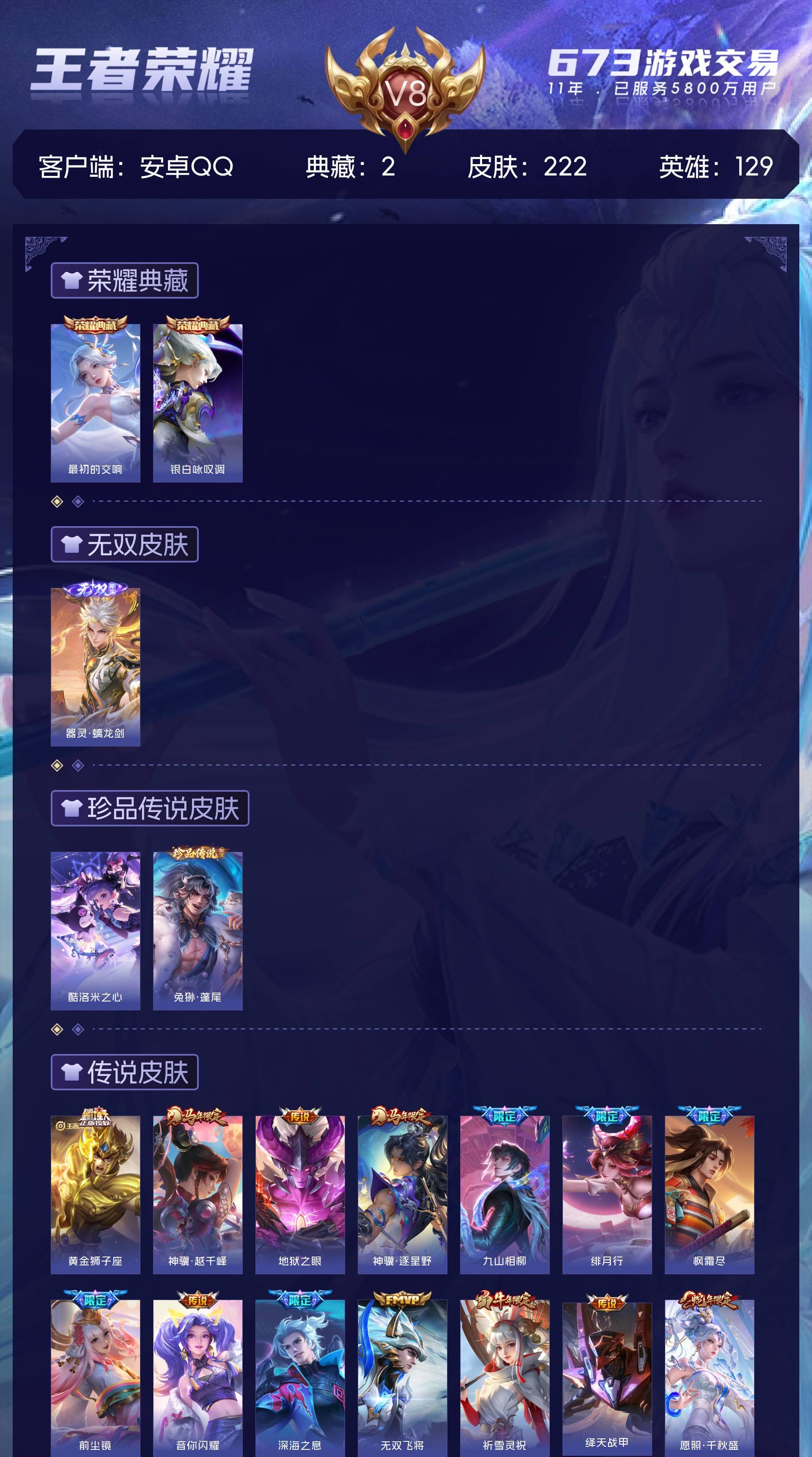 V8 皮肤222 英雄129 至尊星耀 荣耀典藏2 无双皮肤1 珍品传说2 传说33