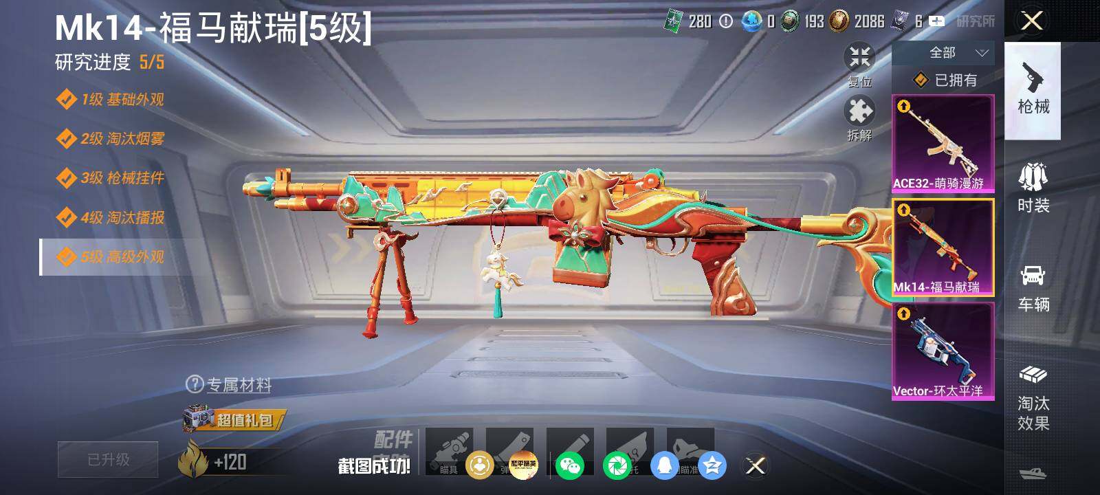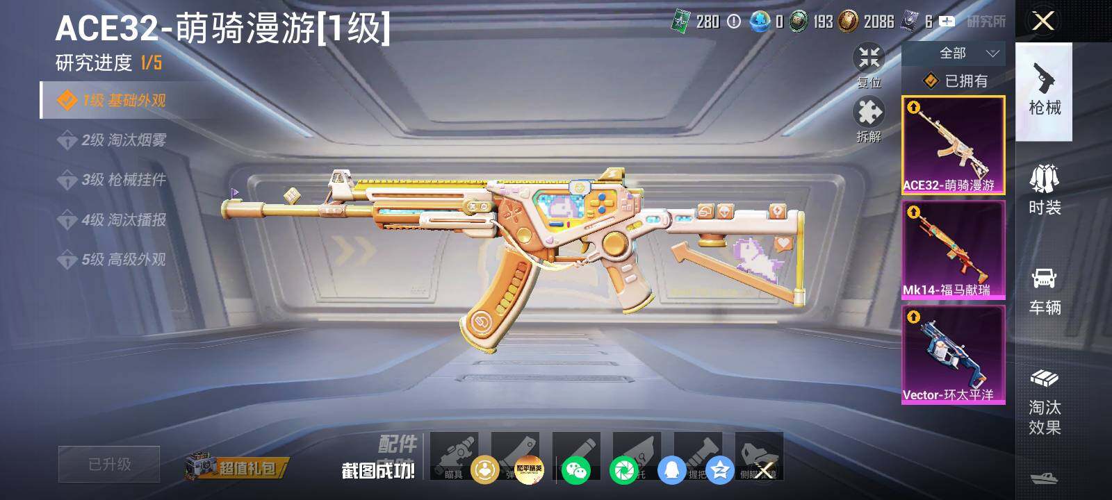 【粉色枪皮等级】:ACE32-萌骑漫游(一级),Vector-环太平洋(四级),Mk14-福马献瑞(五级)