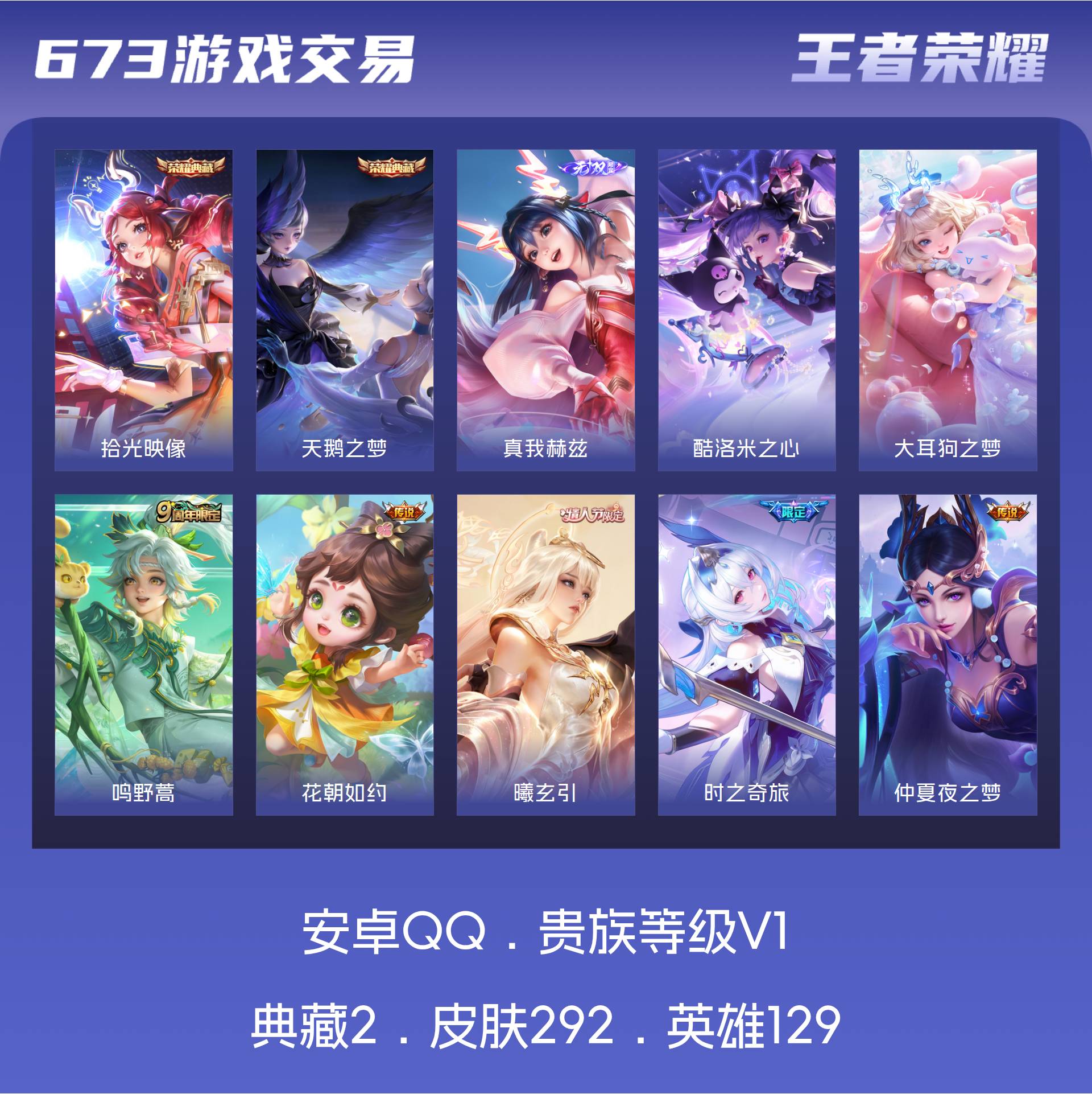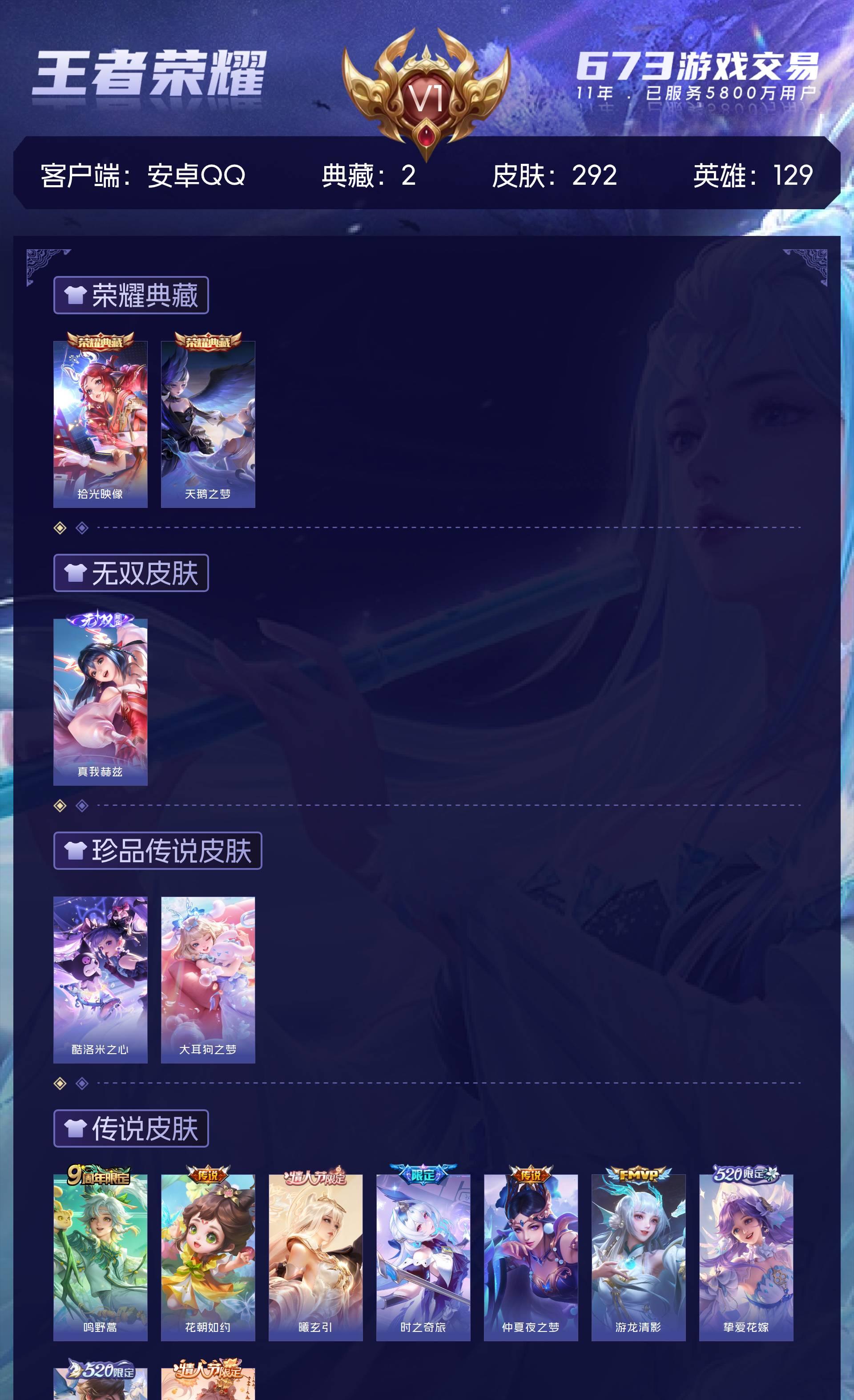 V1 皮肤292 英雄129 永恒钻石 荣耀典藏2 无双皮肤1 珍品传说2 传说9