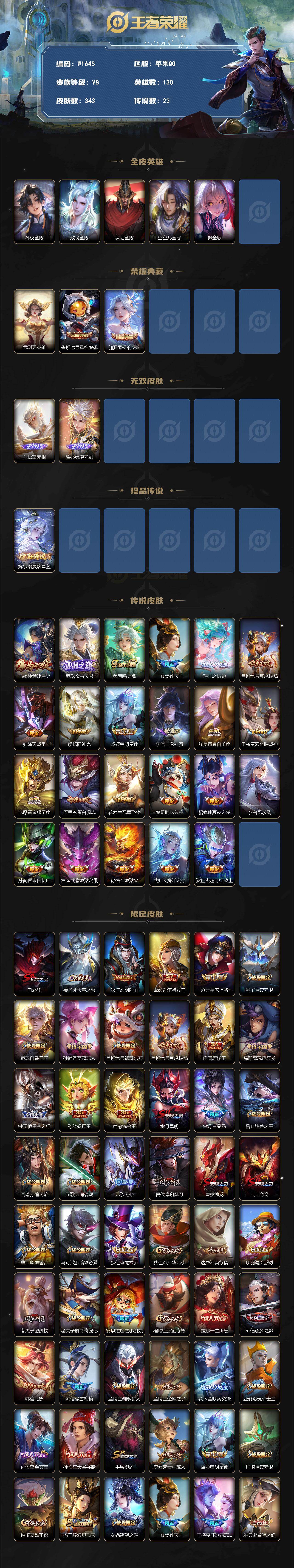 iOS/器灵螭龙剑/无相/最初的交响/星空梦想/武则天/器灵落星盏/金标鲁班七号/金标女娲/343皮肤3典藏2无双1珍品传说23传说