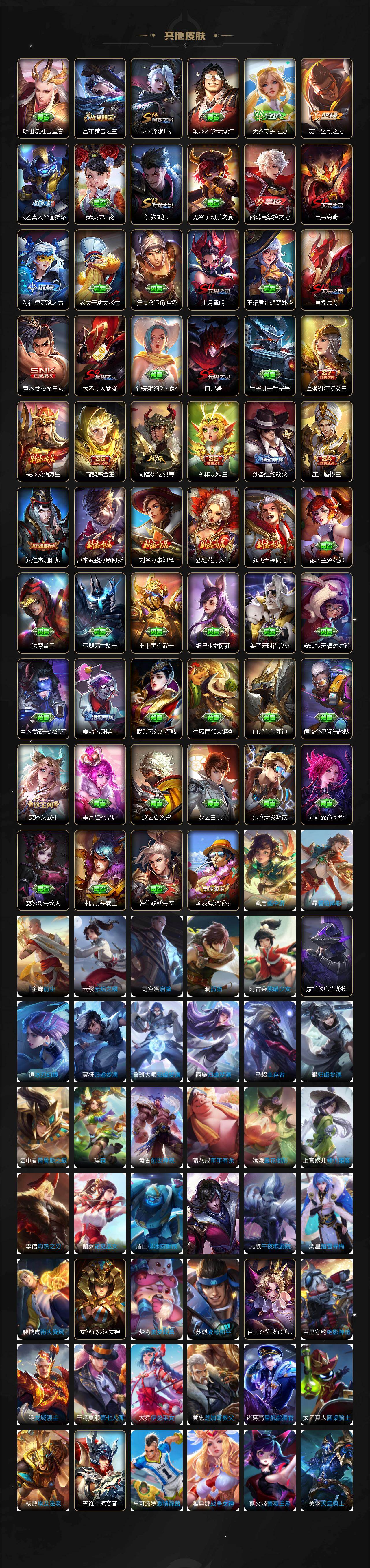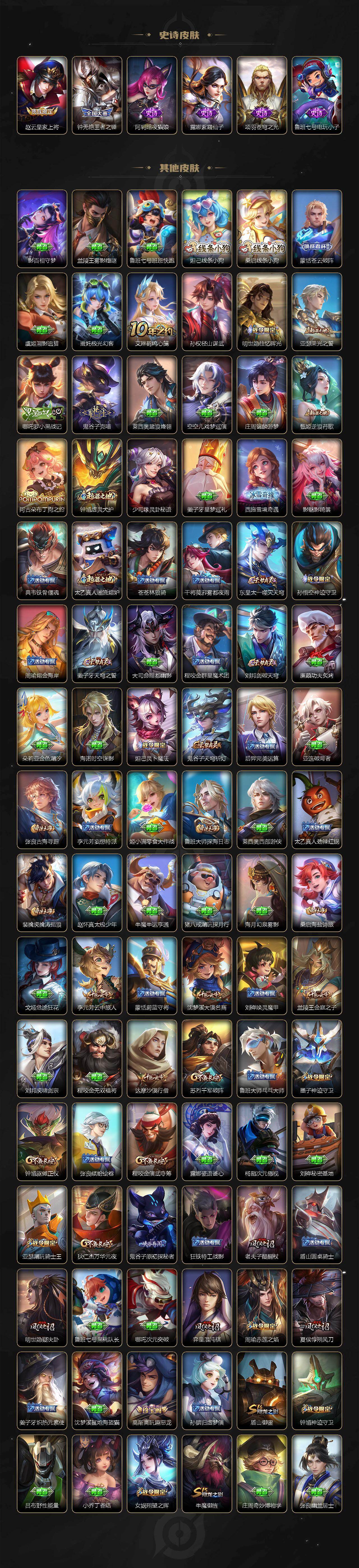 【传说皮肤】:马超神骥逐星野,嬴政玄雷天君,桑启鸣野蒿,女娲补天,瑶时之祈愿,鲁班七号寅虎瑞焰,铠绛天战甲
