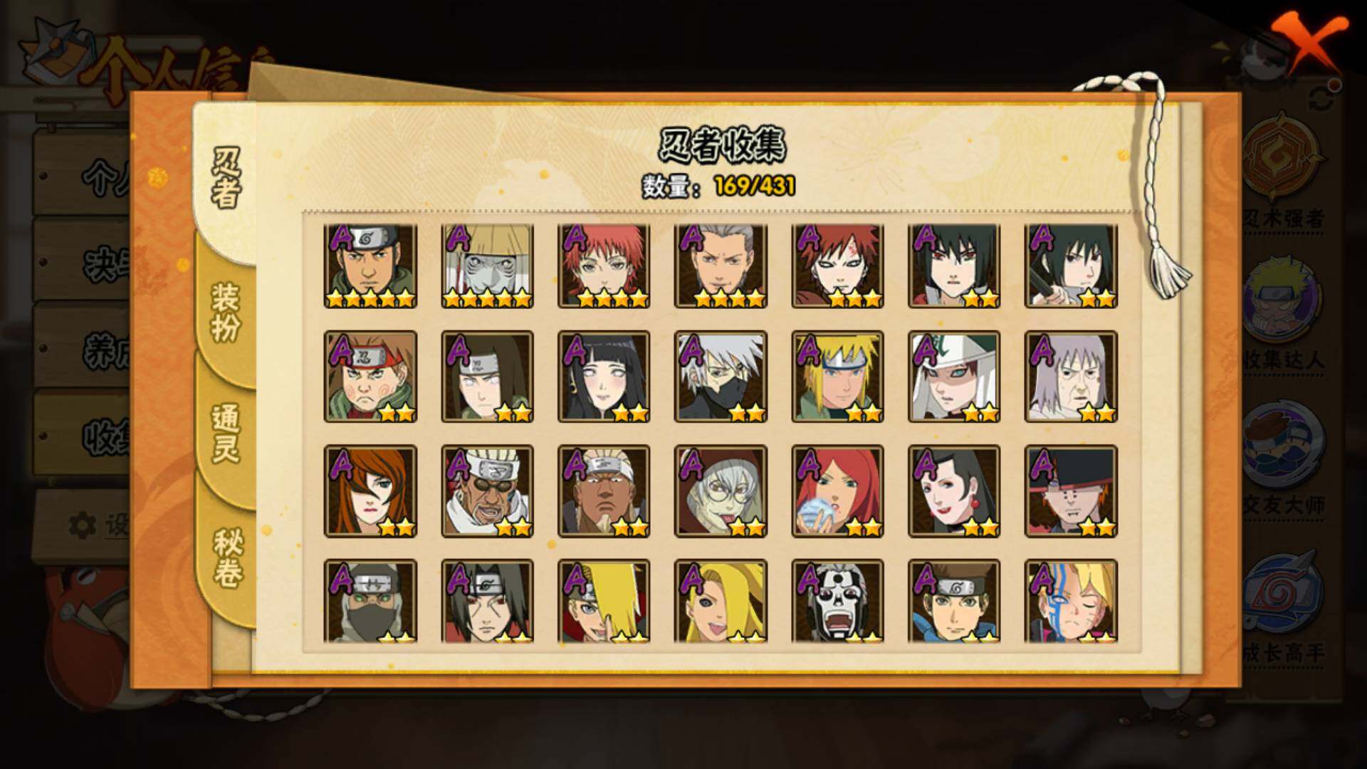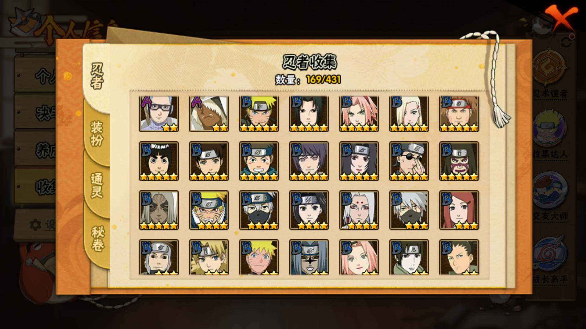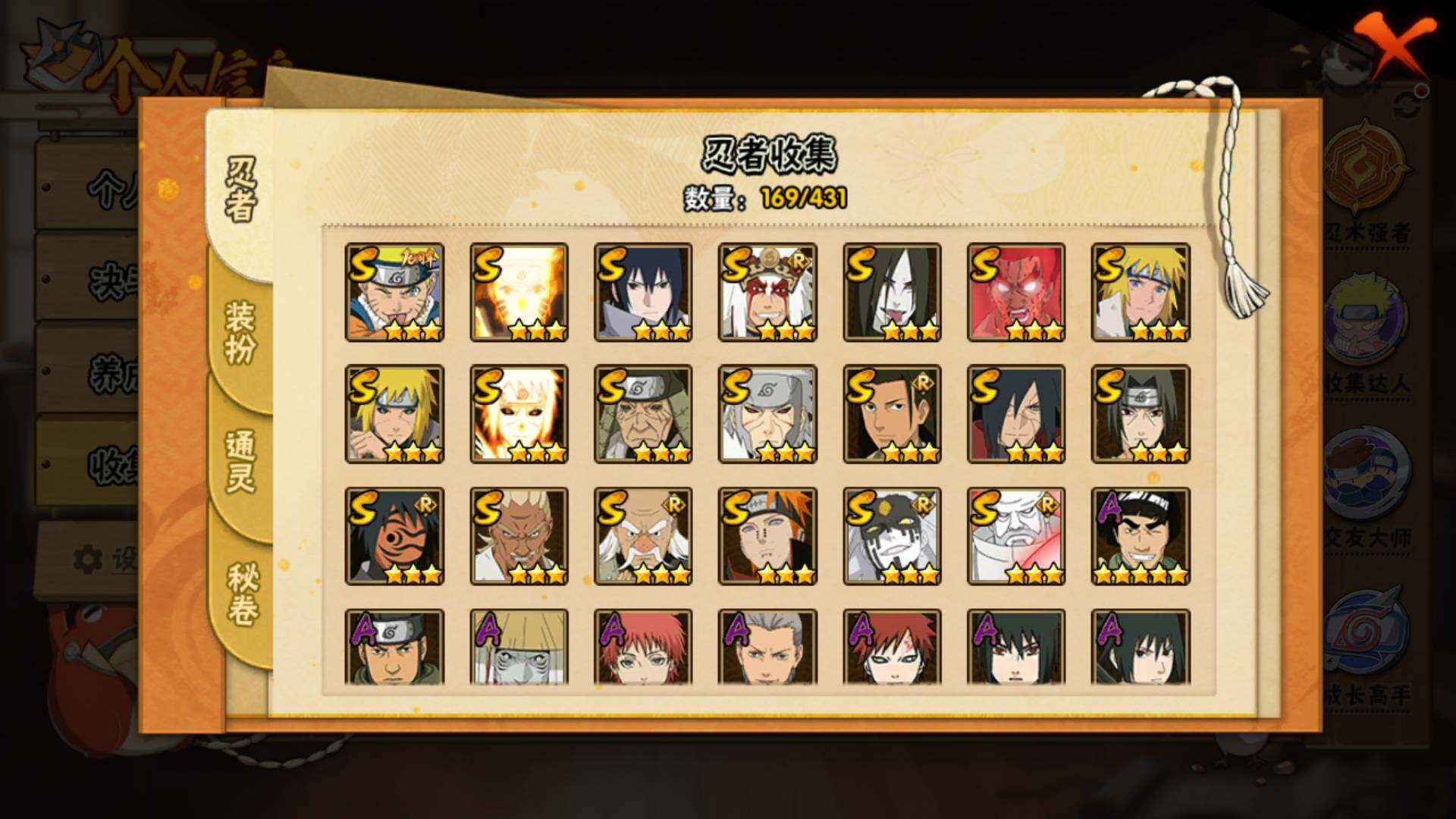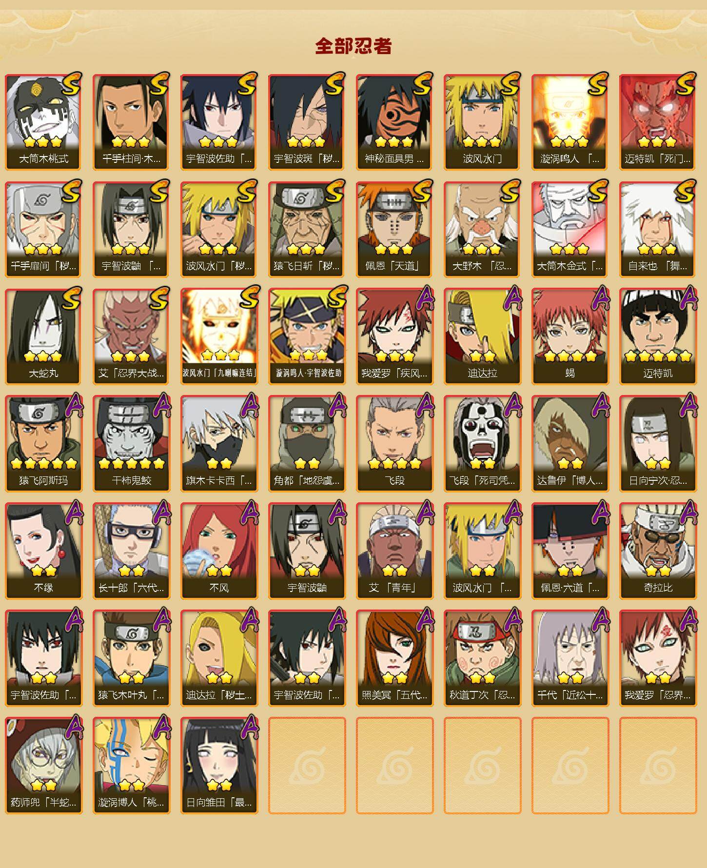 【S级忍者】:猿飞日斩「秽土转生」(3星),波风水门「秽土转生」(3星),千手扉间「秽土转生」(3星),宇智波斑「秽土转生·解」(3星),大野木「忍界大战」(3星),艾「忍界大战」(3星),宇智波鼬「须佐能乎」(3星),千手柱间「木叶创立」