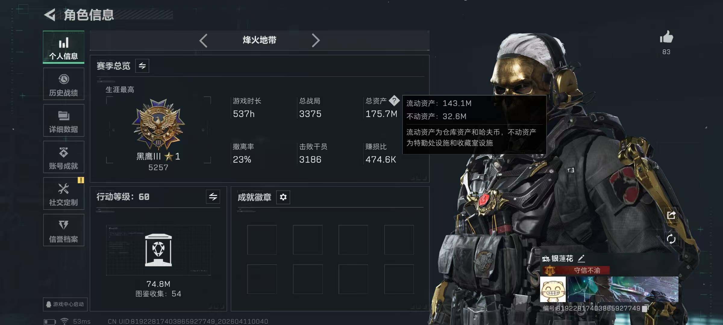 【SJ1732】【1063点卷北极星影锋满体带S8赛季安全箱皮肤零号玩家】60级/总资175M/流资143M/1063点卷/刀皮(影锋+北极星+处刑者)红狼(蚀金玫瑰+电锯惊魂)蜂医(送葬人无题密令)乌鲁鲁(荒原猎手)深蓝(不破誓约)露娜(金牌射手)/8级仓库7级体力6级负重1级潜水/29发AW子弹/两个隐藏挂饰
