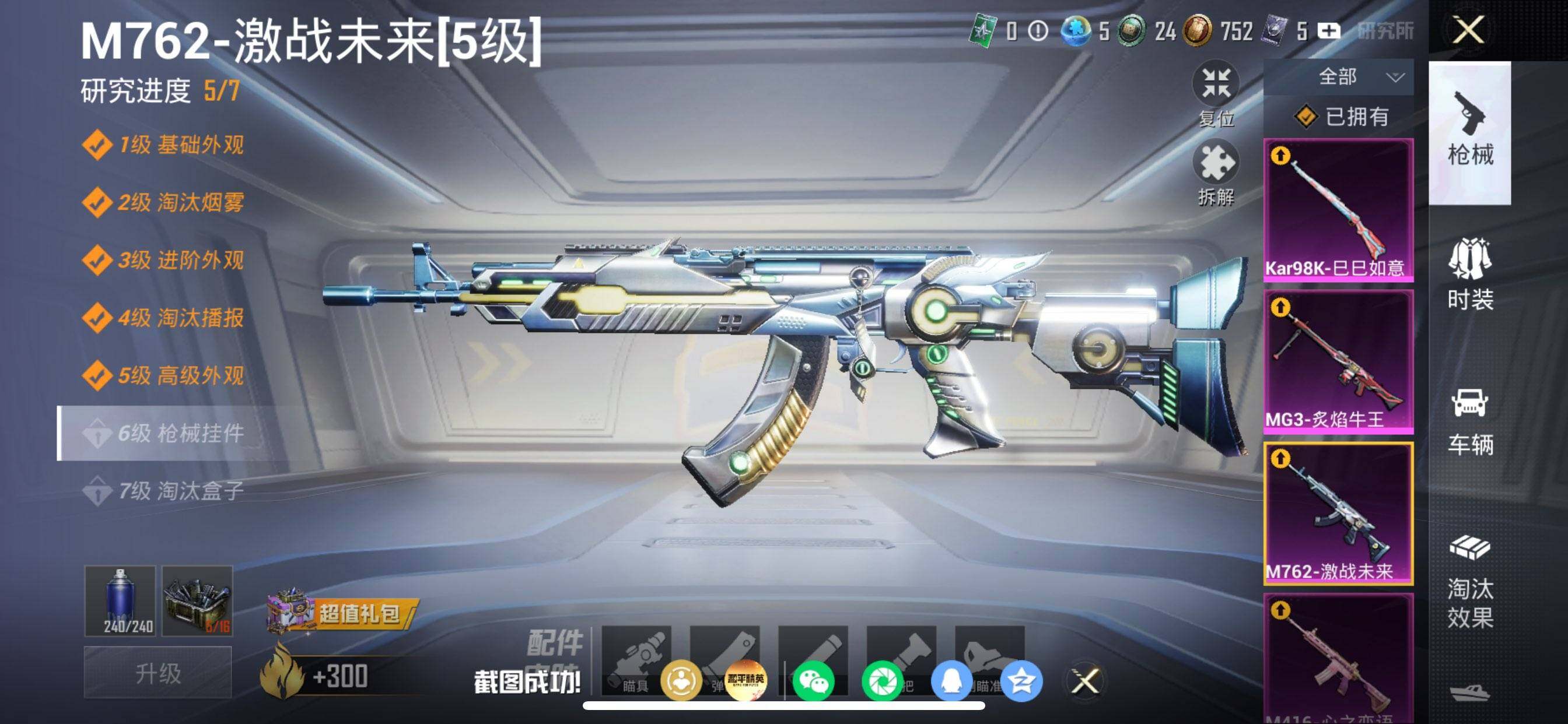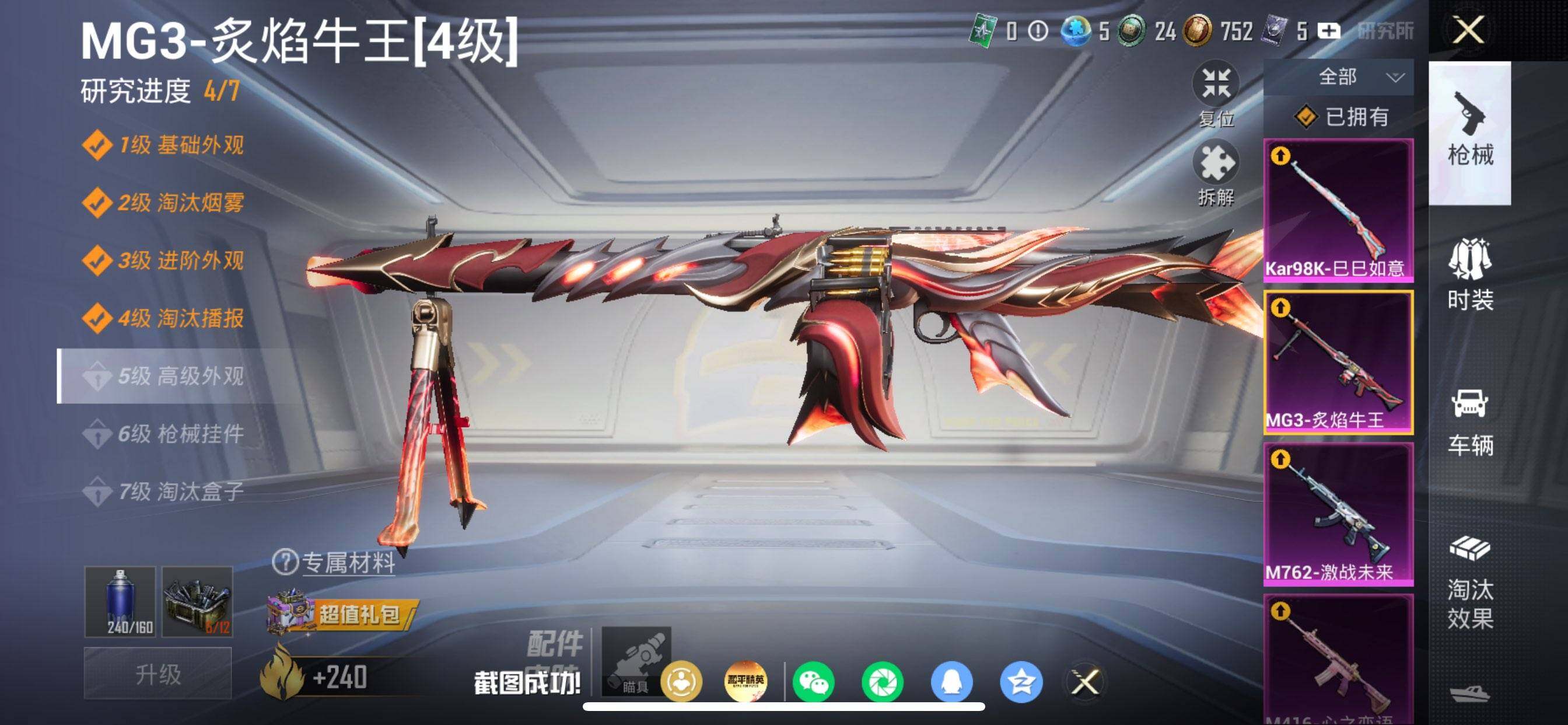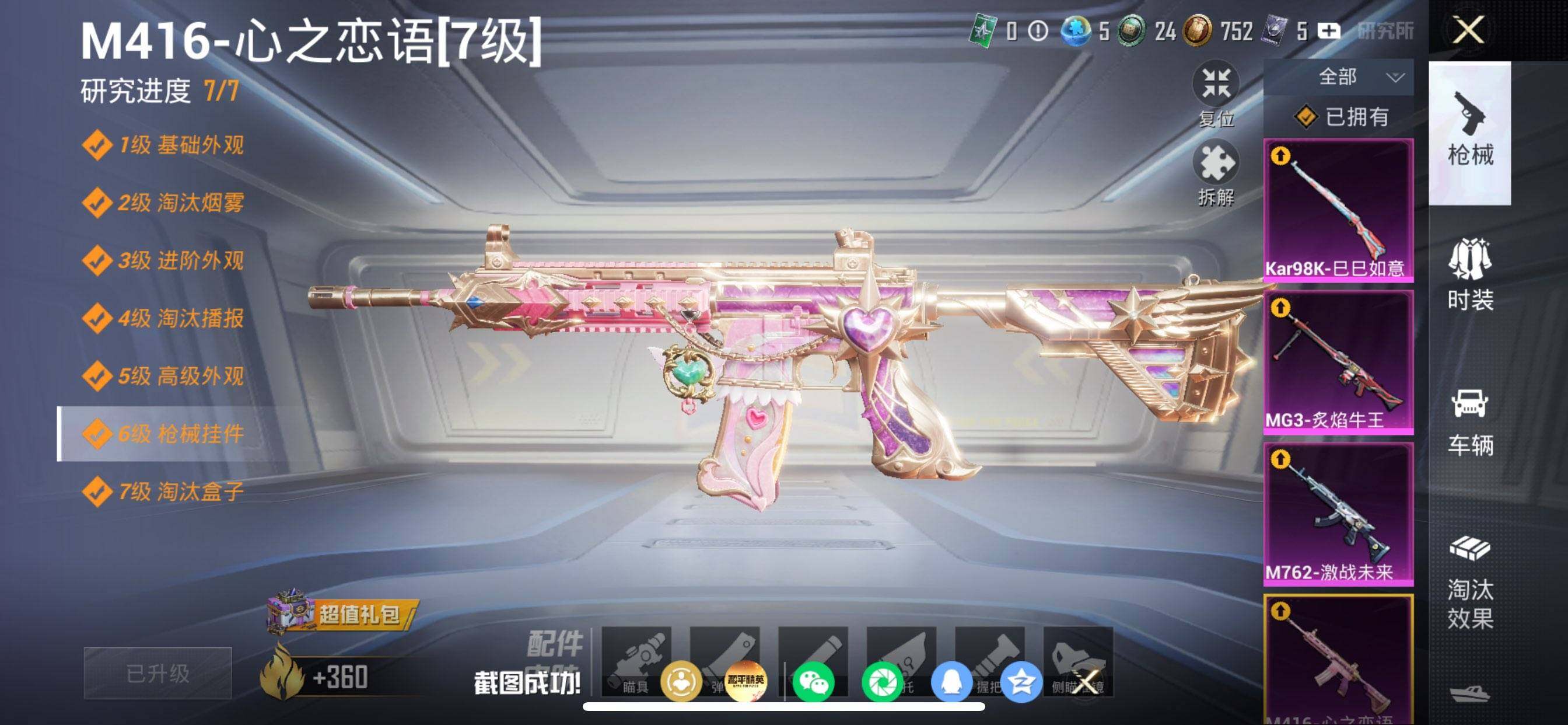 【粉色枪皮等级】:M416-心之恋语(七级),M762-激战未来(五级),Kar98K-巳巳如意(五级),MG3-炙焰牛王(四级)