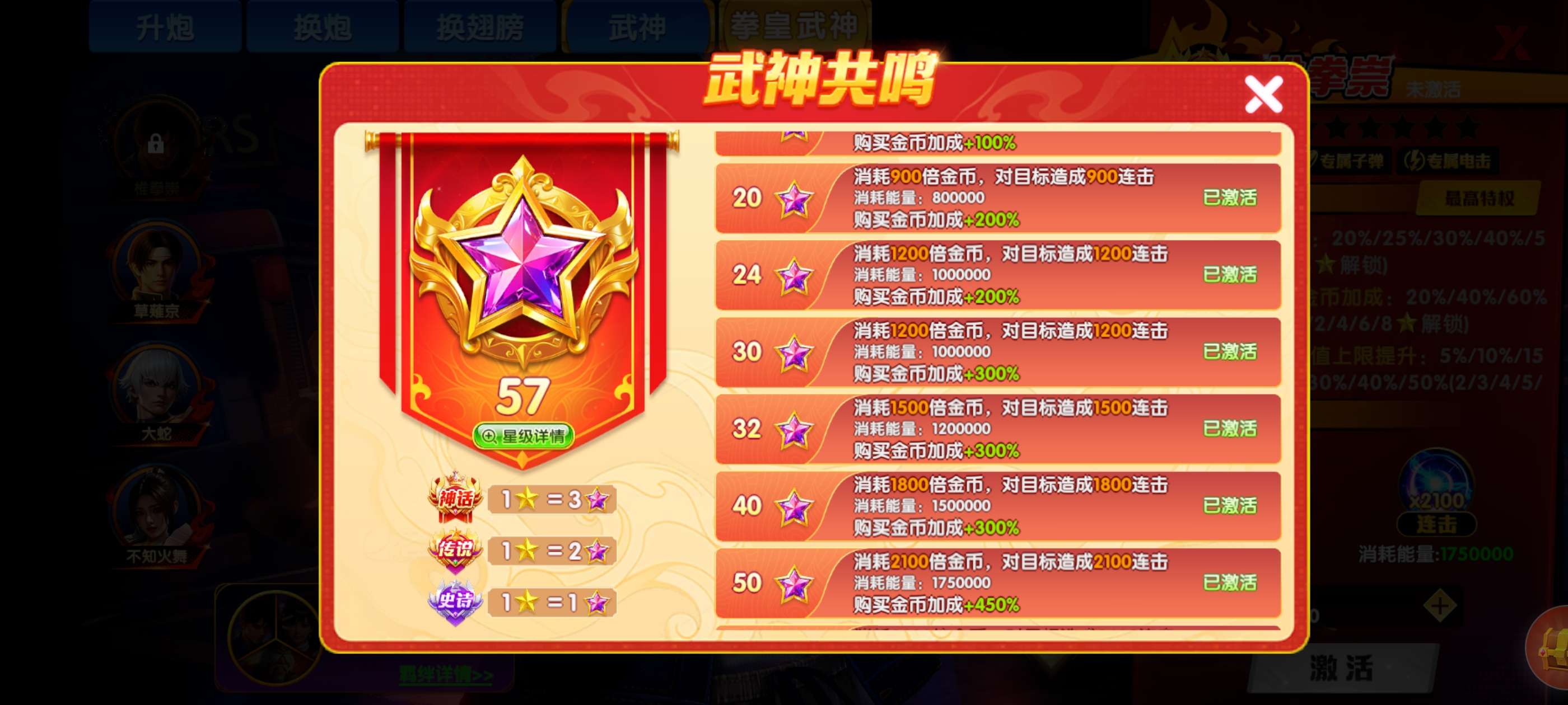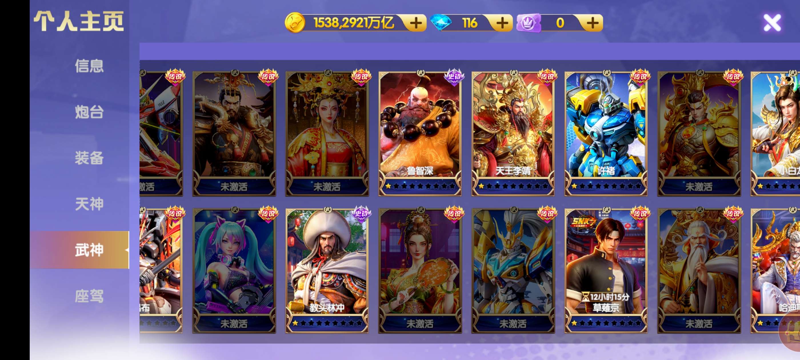 1536兆,3万炮神装25级,天王觉醒双龙。洪荒限时6级西游三星,21武神连击1800。7万炸弹送拉