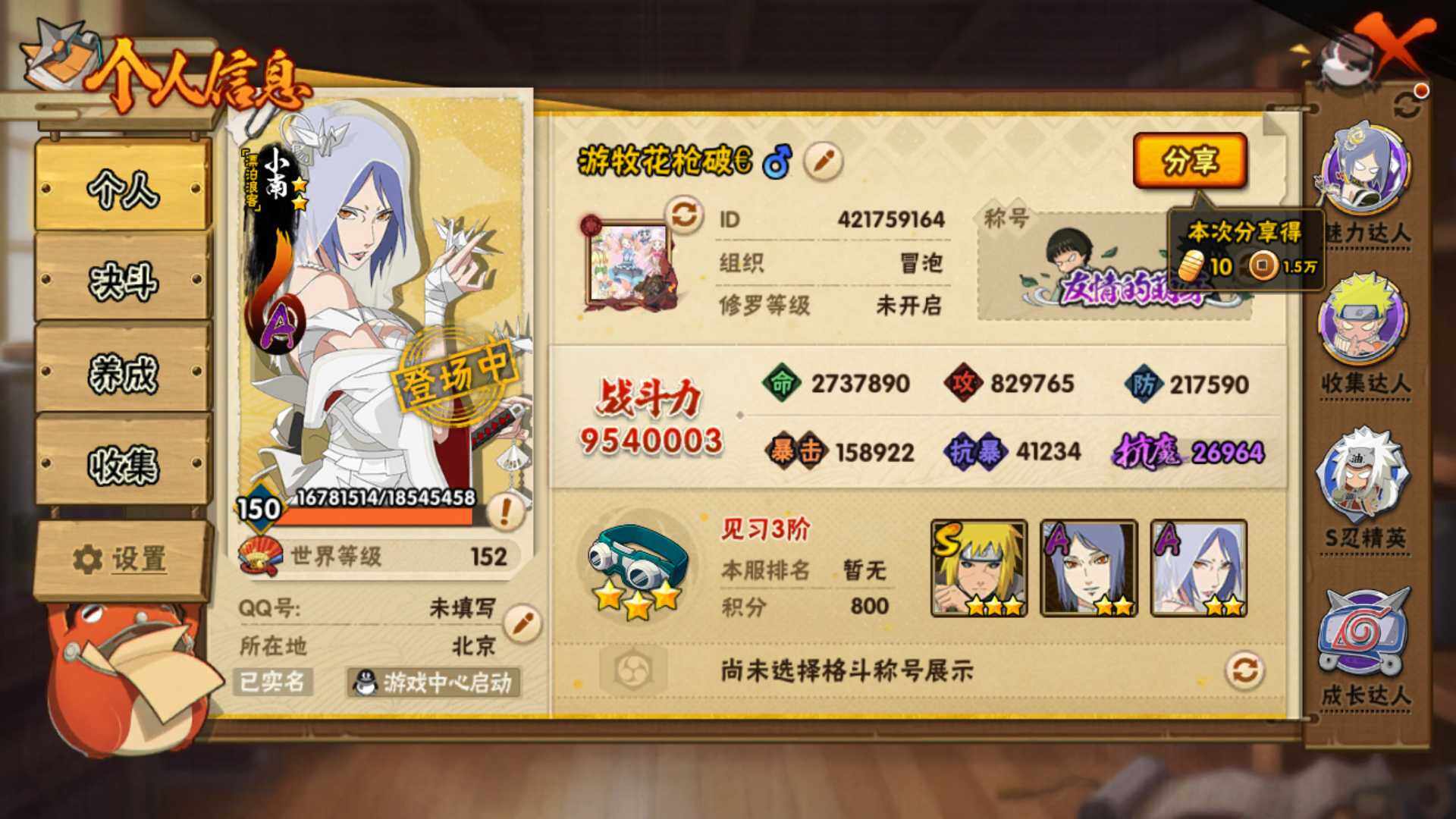 (可免费转苹果)V13 19S 47A 954万战力 1万金币 有熊猫 166个高招卷 已购25忍法帖 热门A百豪樱 疾风佐助 忍战我爱罗 漂泊六道 新春鼬 泳装小南 漂泊小南 暴怒带土 夏日鼬 S碎片创立柱间40片 自来也50片 创立斑80片 天道佩恩50片 无50片。YY2124