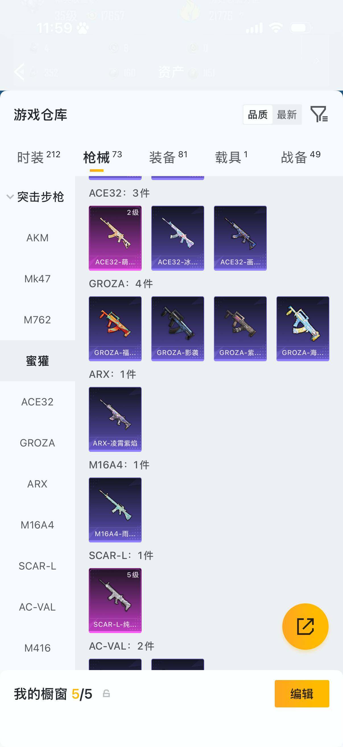 【粉色枪皮等级】:SCAR-L-纯梦嫁纱(五级),ACE32-萌骑漫游(二级),Vector-环太平洋(五级),AKS-74U-森灵之息(五级),Mk14-福马献瑞(三级),DP-28-豹影疾电