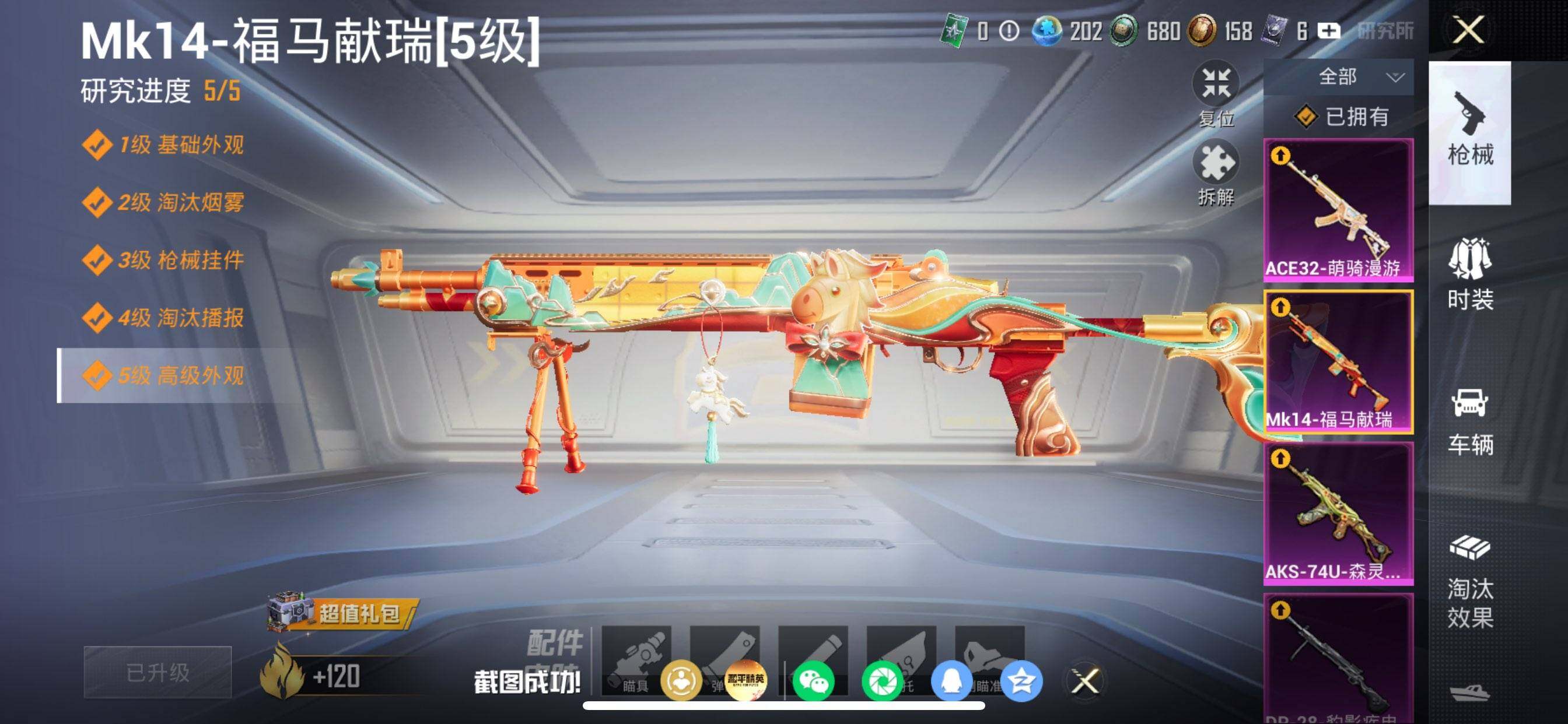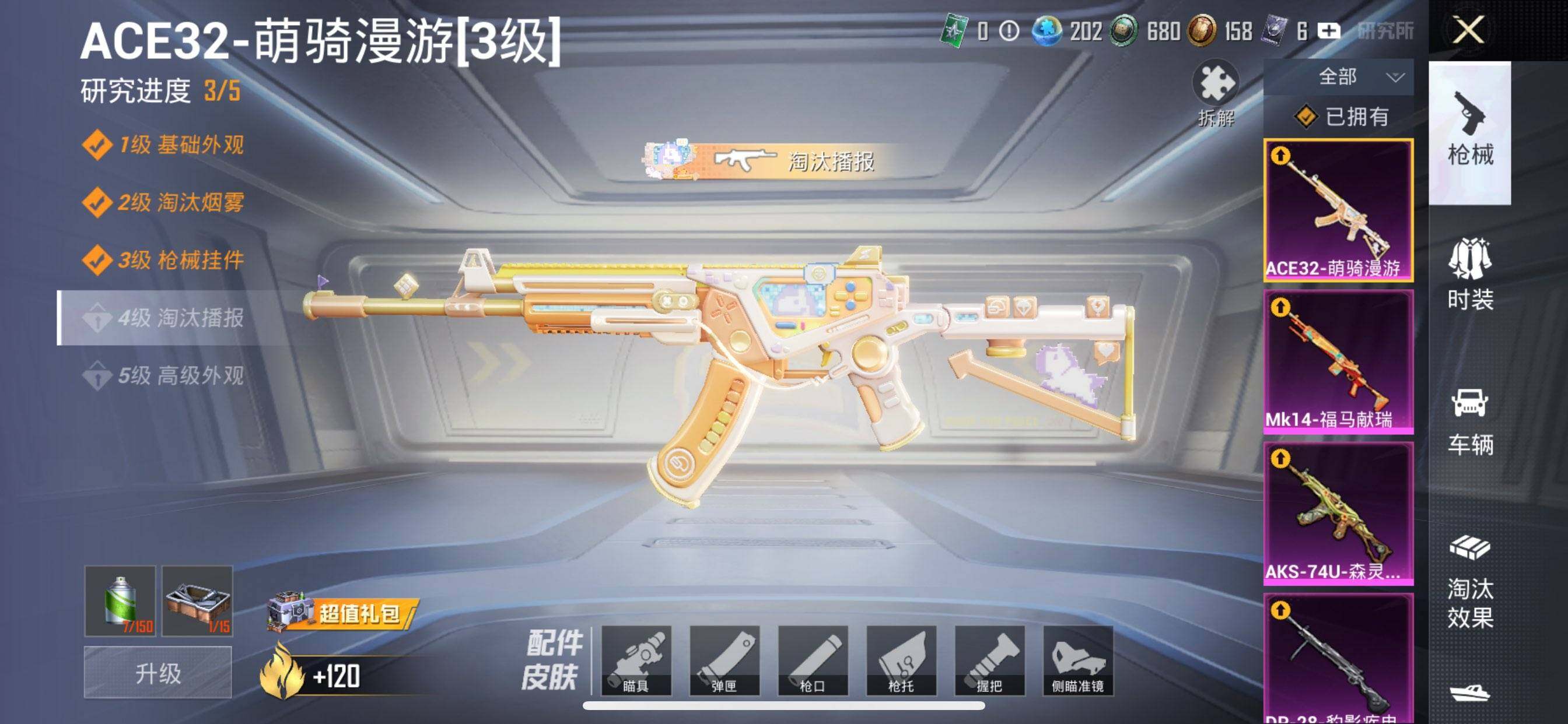 【粉色枪皮等级】:GROZA-香水柠檬(七级),ACE32-萌骑漫游(三级),AKS-74U-森灵之息(五级),Kar98K-巳巳如意(五级),Mk14-福马