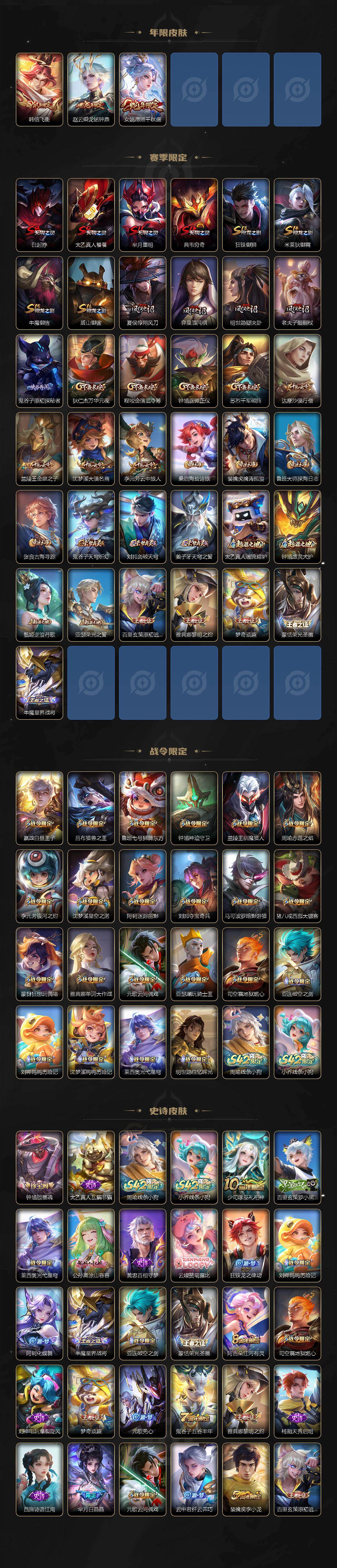 【16777008】贵族等级7/荣耀典藏数量1/传说皮肤数量10/史诗皮肤数量87/皮肤数量315/英雄数量128/段位至尊星耀/刘禅全皮/蒙恬全皮/空空儿全皮/貂蝉-幻阙歌/嫦娥-器灵·落星盏/貂蝉神骥聚万邦/后羿神树通天/西施续相思/女娲-愿照·千秋盛/桑启-鸣野蒿/赵云-乘龙·铭钟鼎/西施-游龙清影/干将莫邪-久胜战神/宫本武藏-地狱之眼/狄仁杰-超时空战士/