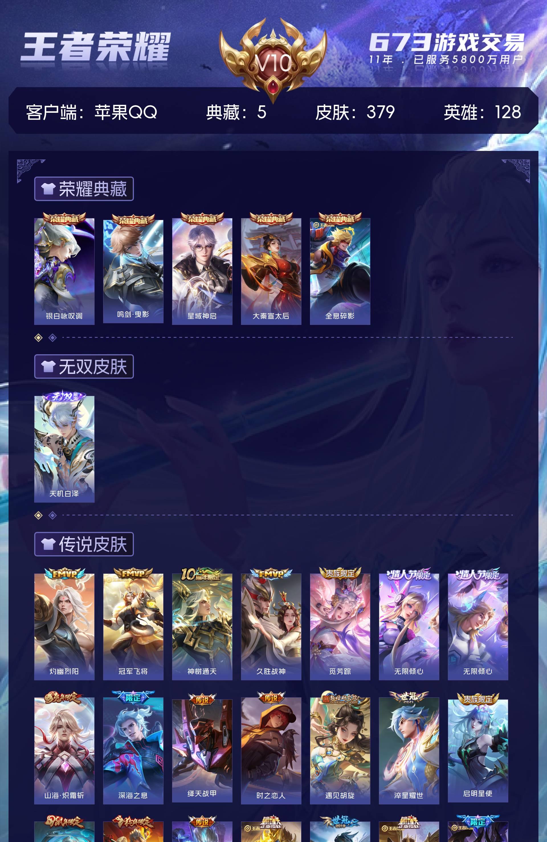 V10 皮肤379 英雄128 永恒钻石 荣耀典藏5 无双皮肤1 星传说3 传说26