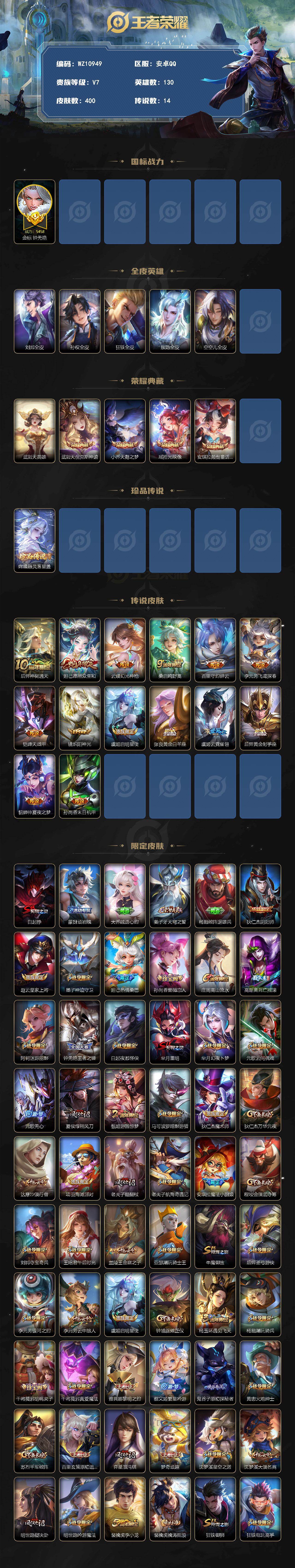 安卓Q-V7-尊贵铂金IV段位-130英雄-400皮肤-4典藏皮肤-1典藏英雄-1珍品传说-14传说-108史诗