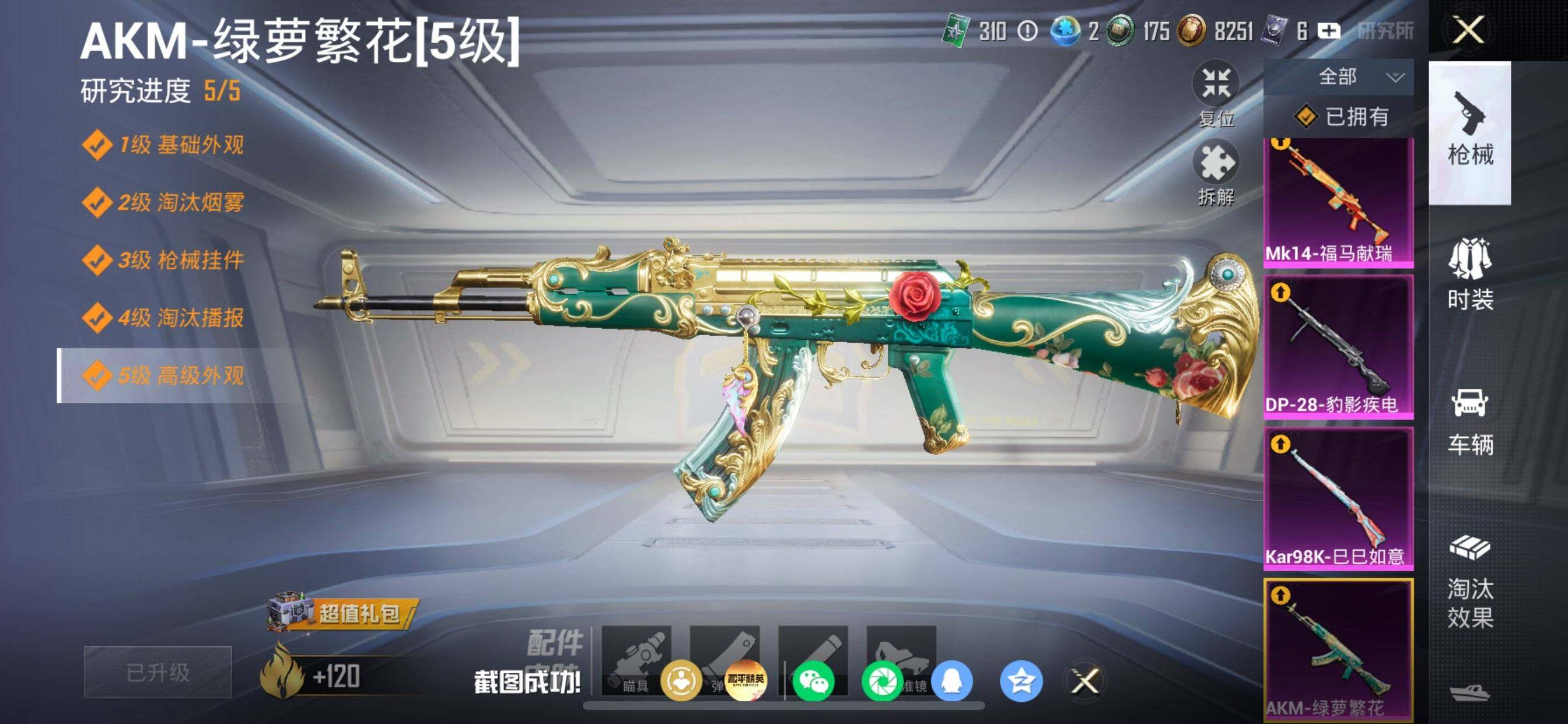 【粉色枪皮等级】:AKM-绿萝繁花(五级),ACE32-萌骑漫游(五级),Kar98K-巳巳如意(五级),Mk14-福马献瑞(五级),DP-28-豹影疾电(五级)