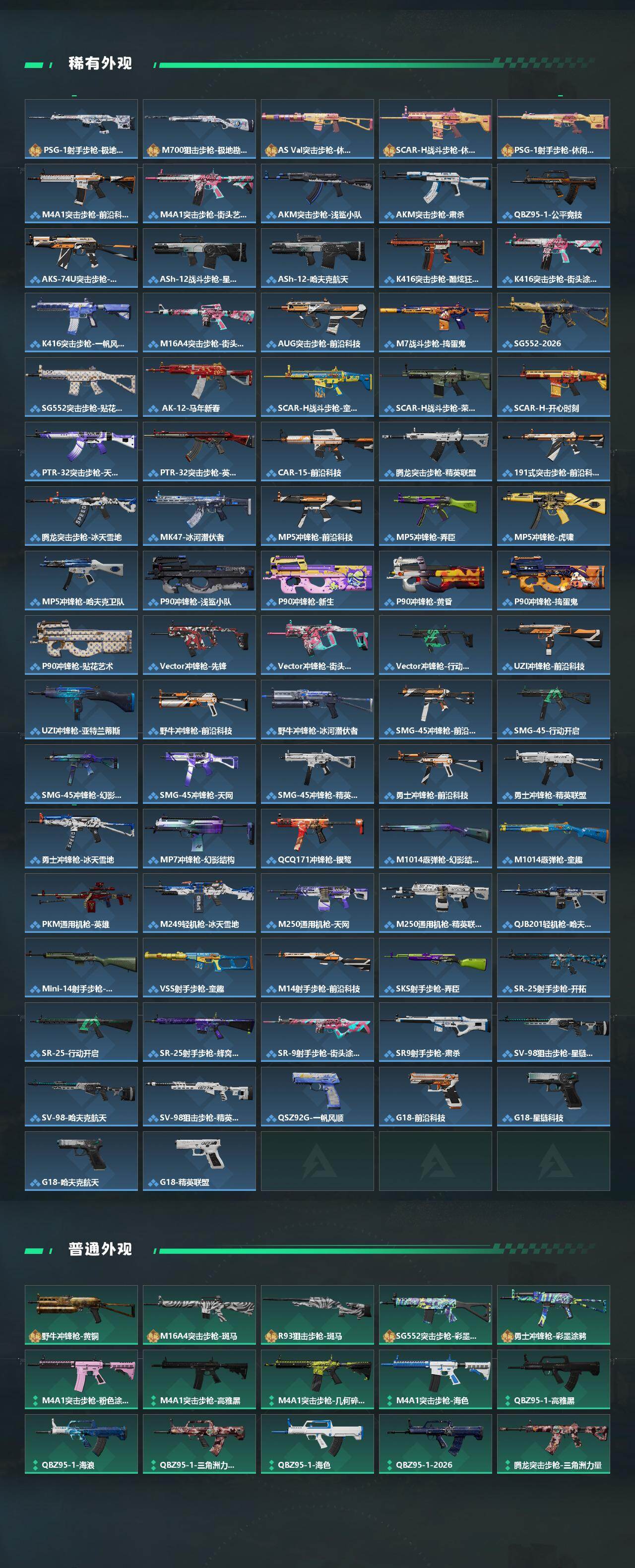【传说外观】:M4A1突击步枪-阿米娅,AKM突击步枪-锦绣,ASh-12战斗步枪-鹅鸭杀,M7战斗步枪-零度协议,SG552突击步枪-点翠,AK-1