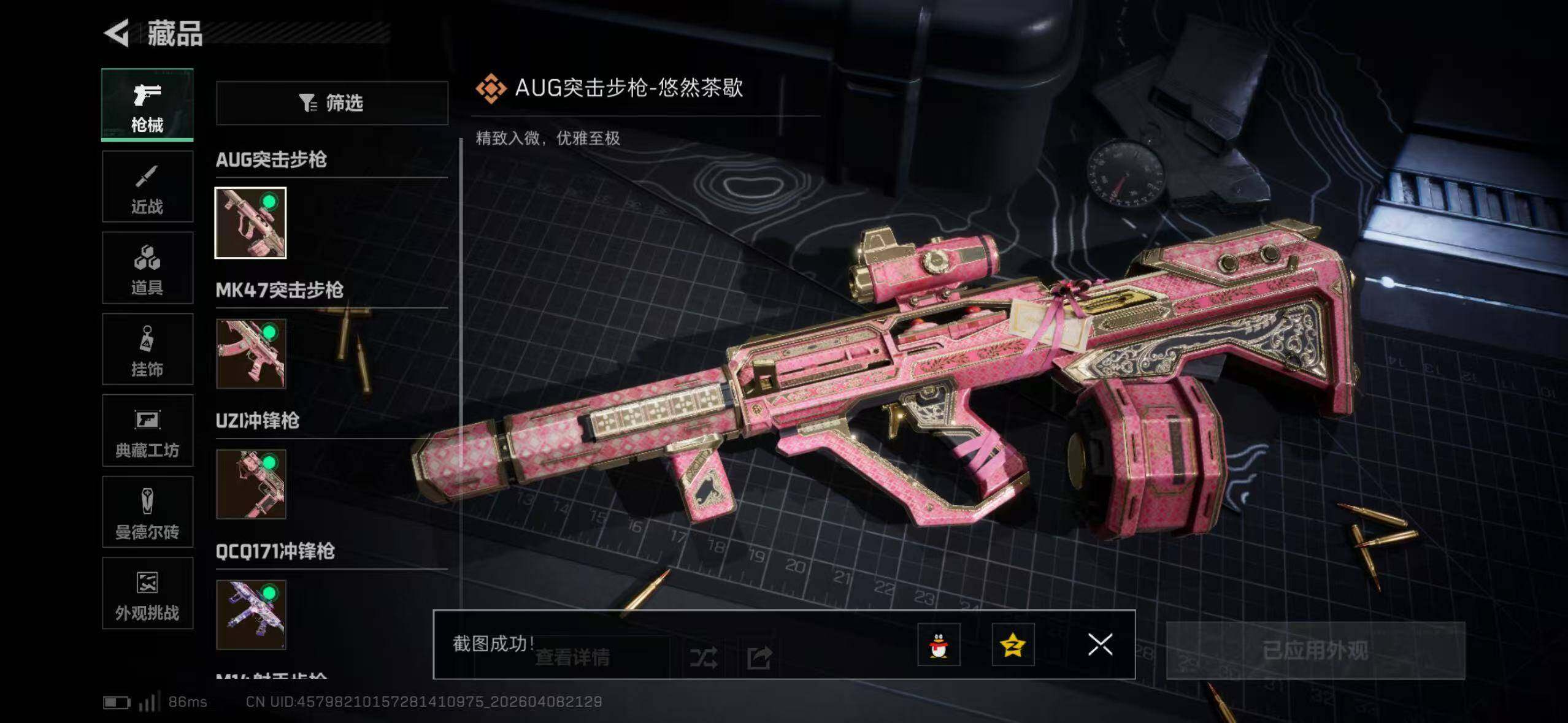 【传说外观】:AUG突击步枪-悠然茶歇,MK47突击步枪-悠然茶歇,UZI冲锋枪-悠然茶歇,QCQ171冲锋枪-不羁人生,M14射手步枪-缄花,SR-25射手步枪-缄花,.357左轮-缄花