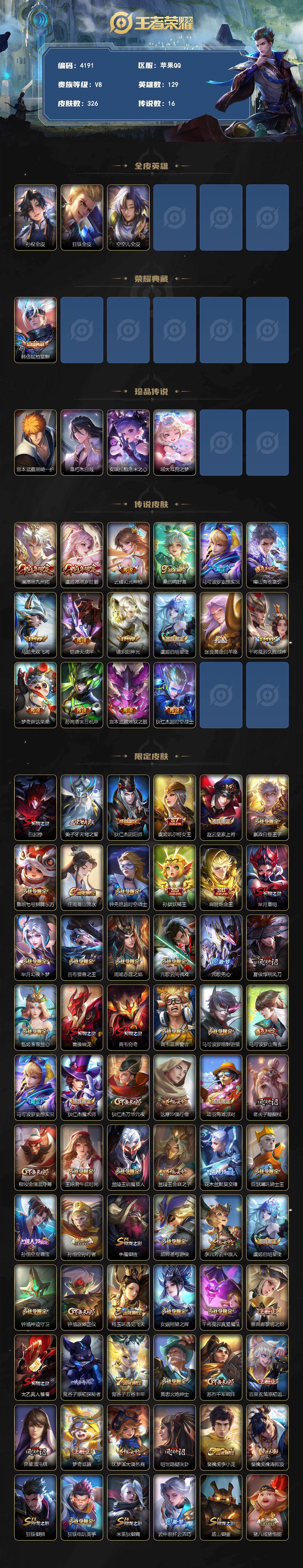 苹果Q-V8-永恒钻石V段位-129英雄-326皮肤-1典藏皮肤-4珍品传说-16传说-87史诗
