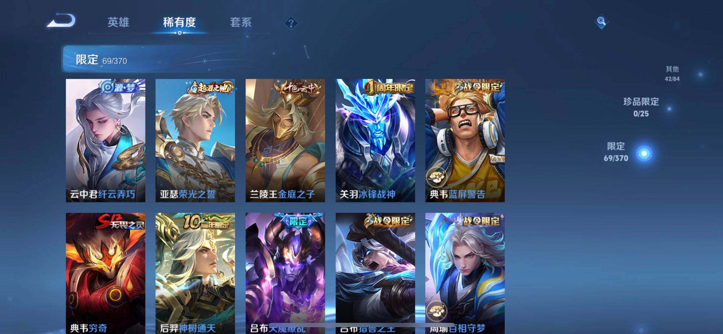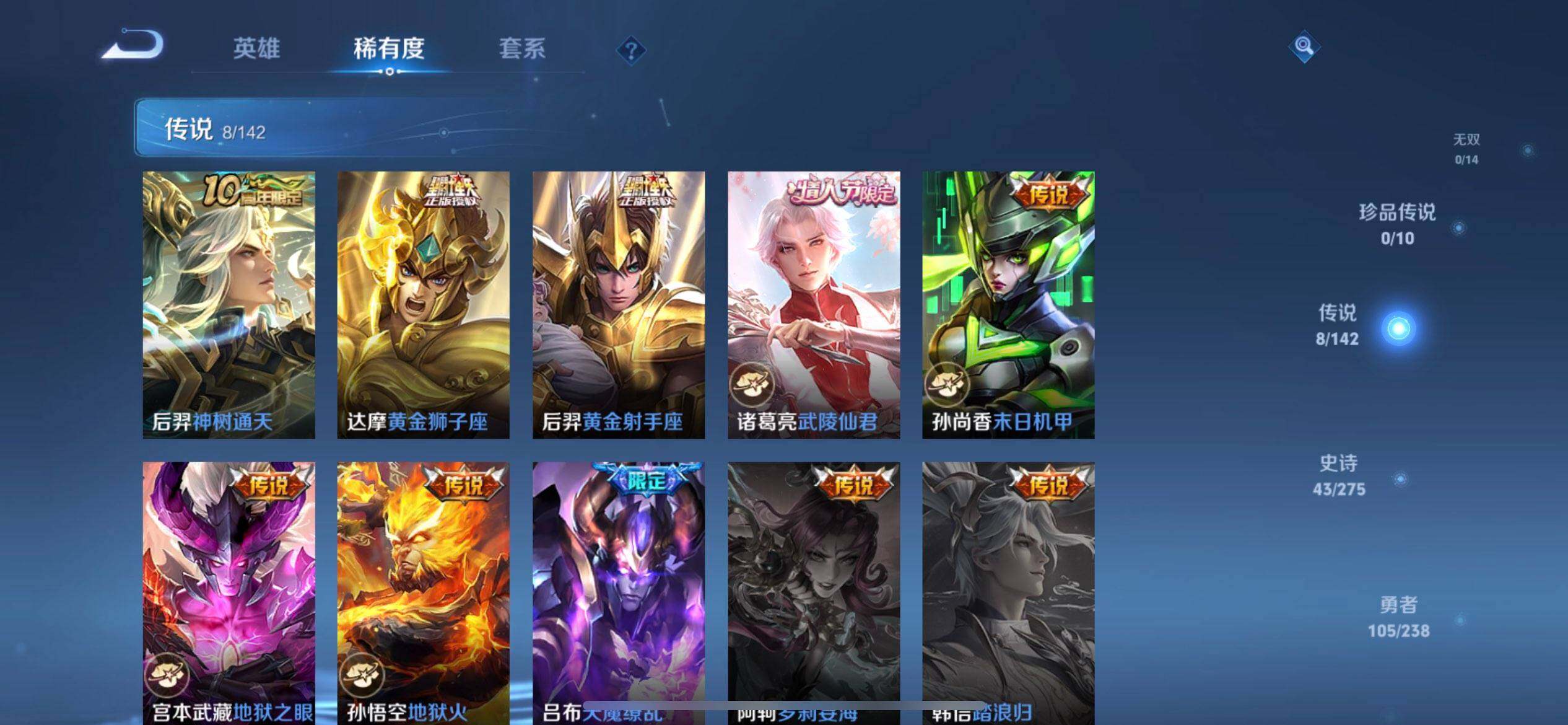 【传说皮肤】:后羿神树通天,达摩黄金狮子座,后羿黄金射手座,诸葛亮武陵仙君,孙尚香末日机甲,宫本武藏地狱之眼,孙悟空地狱火,吕布天魔缭乱