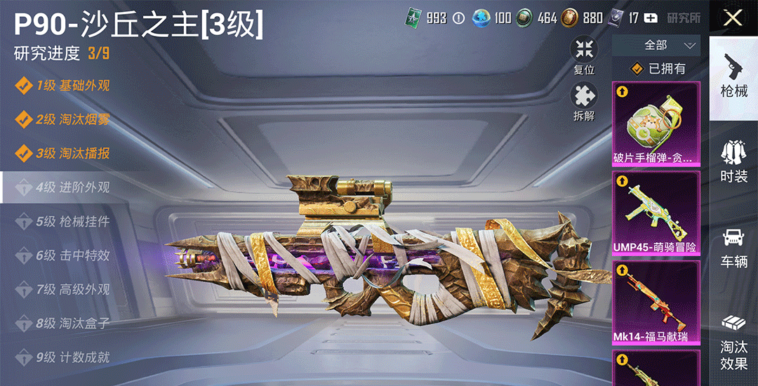 特效枪5:P90-沙丘之主/3级,,Mk14-福马献瑞/5级,,AKS-74U-森灵之息/5级,,UMP45-萌骑冒险/2级,,破片手榴弹-贪吃小熊/5级,