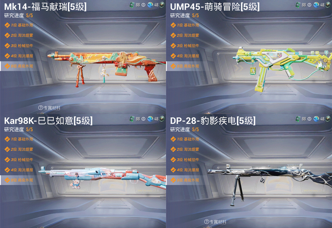 特效枪4:UMP45-萌骑冒险/5级,,DP-28-豹影疾电/5级,Kar98K-巳巳如意/5级,,Mk14-福马献瑞/5级,