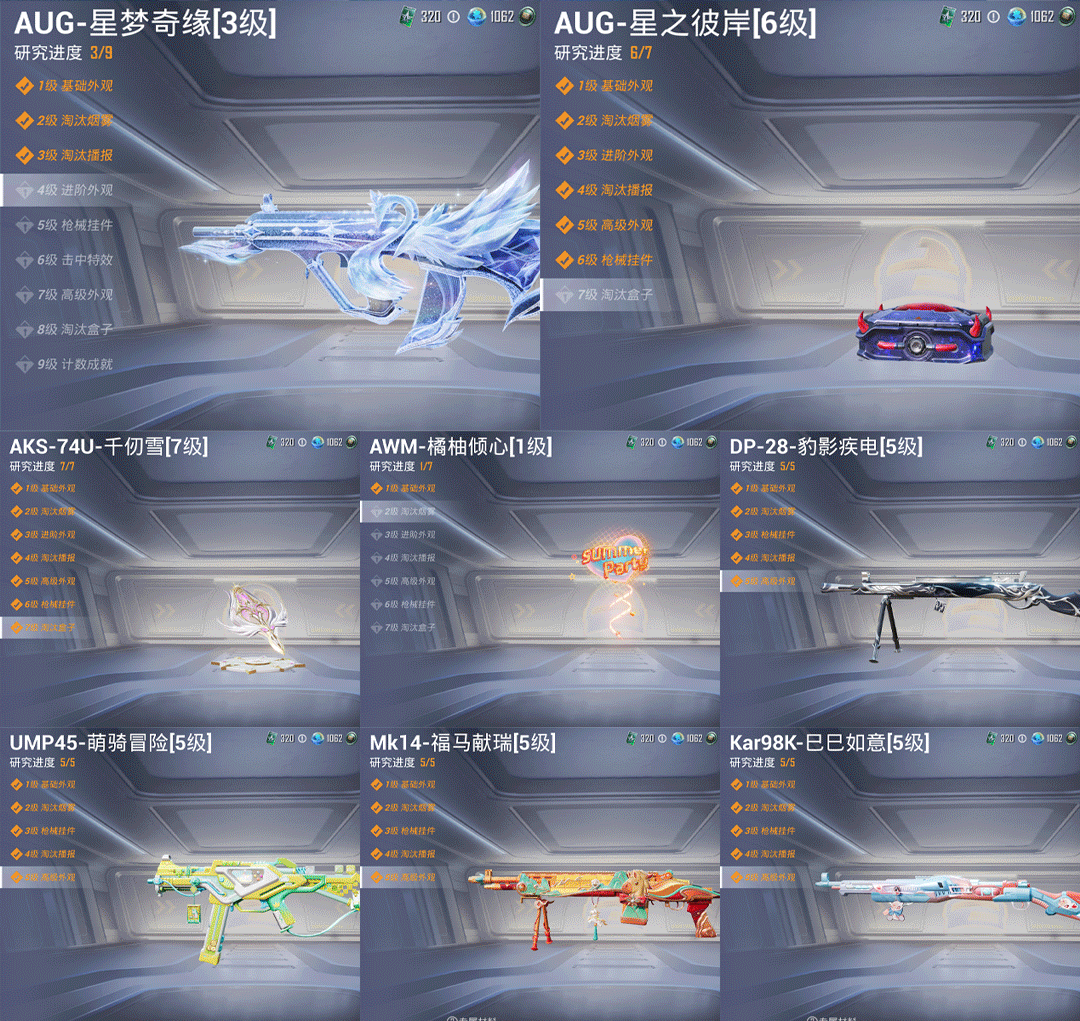 特效枪8:AUG-星梦奇缘/3级,AUG-星之彼岸/6级,,Mk14-福马献瑞/5级,,AWM-橘柚倾心/1级,,Kar98K-巳巳如意/5级,,AKS-74U-千仞雪/7级,,DP-28-豹影疾电/5级,,UMP45-萌骑冒险/5级,,