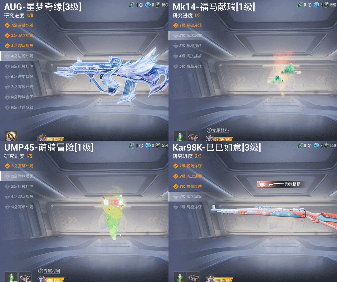 特效枪4:AUG-星梦奇缘/3级,,UMP45-萌骑冒险/1级,,Mk14-福马献瑞/1级,,Kar98K-巳巳如意/3级,