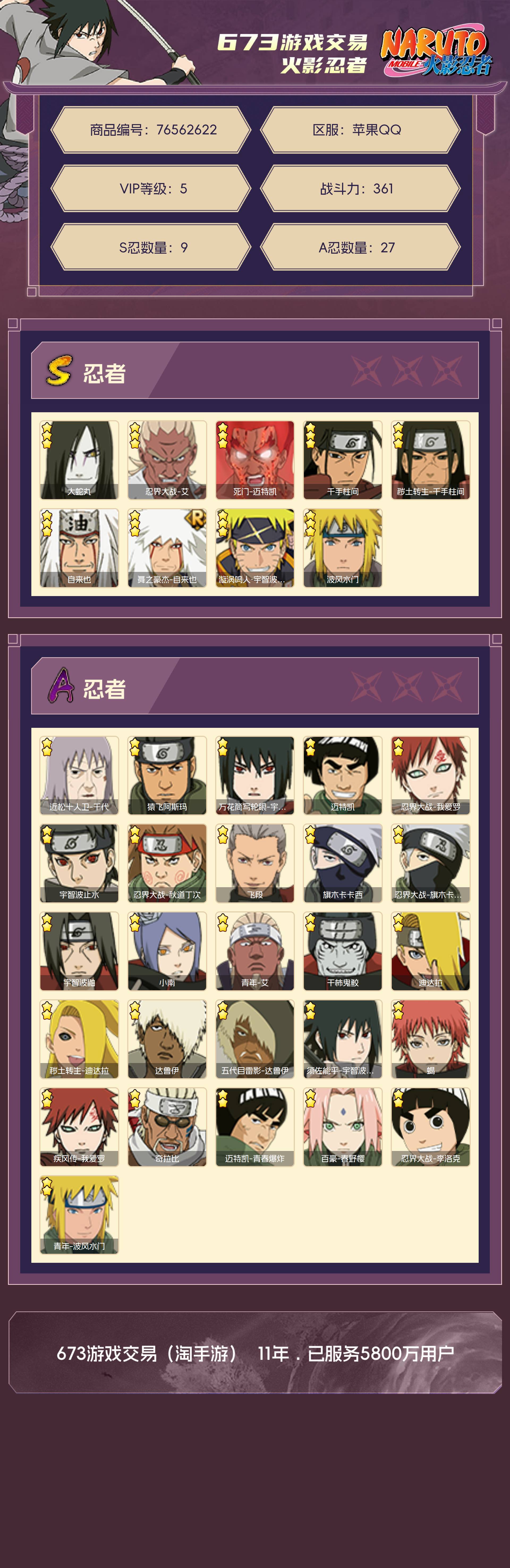 角色等级139 金币438 战斗力361 S忍9 A忍27 5星S忍者7 5 段位中忍