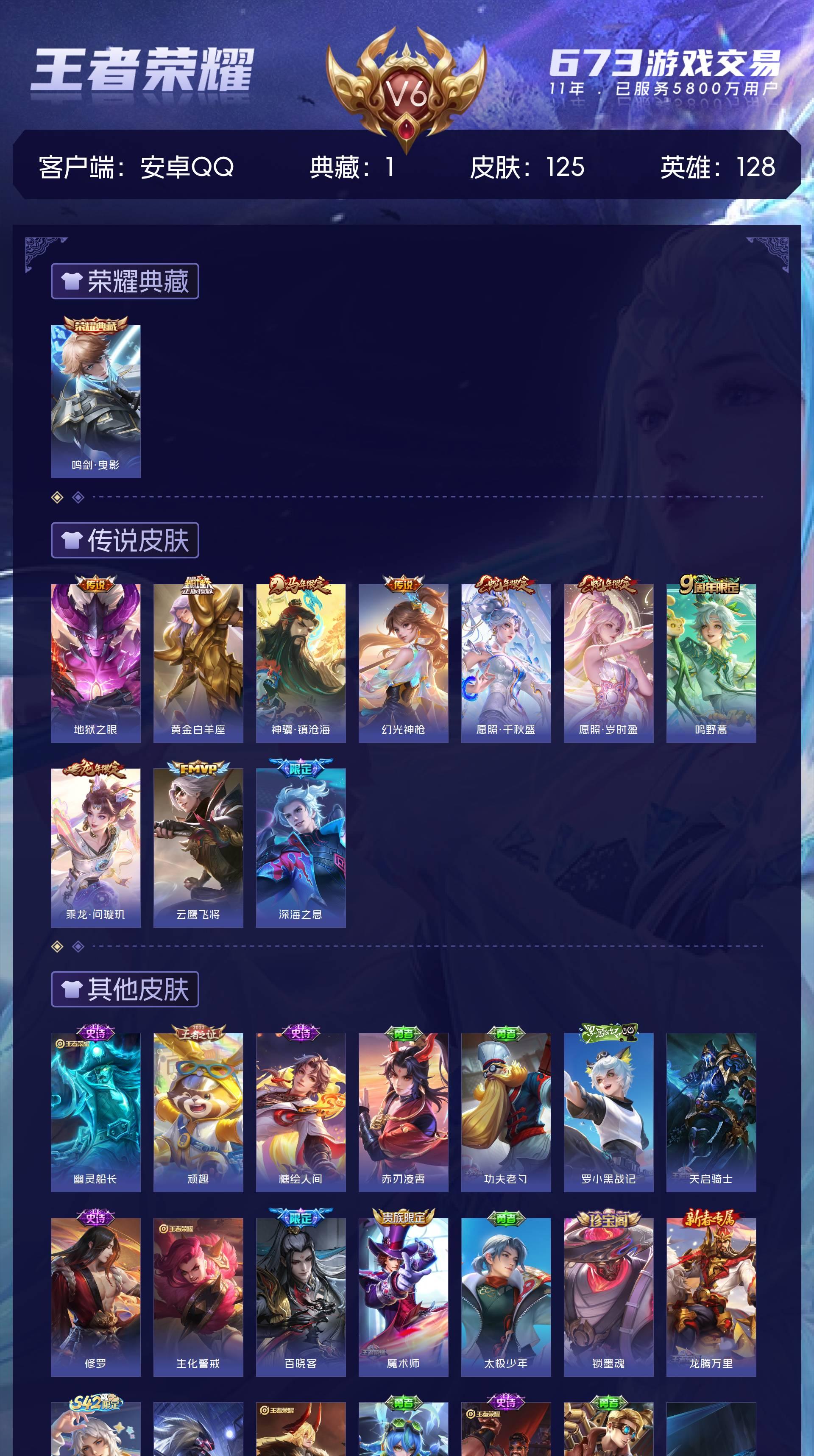 V6 皮肤125 英雄128 永恒钻石 荣耀典藏1 传说10