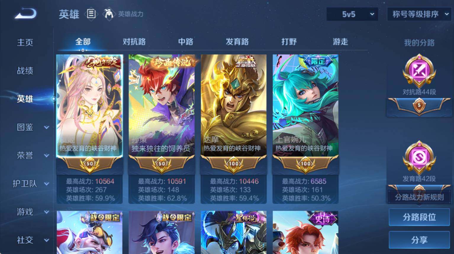 【极品对抗发育路号对抗路44段发育路42段4金标万战虞姬万战孙策万战达摩1典藏1