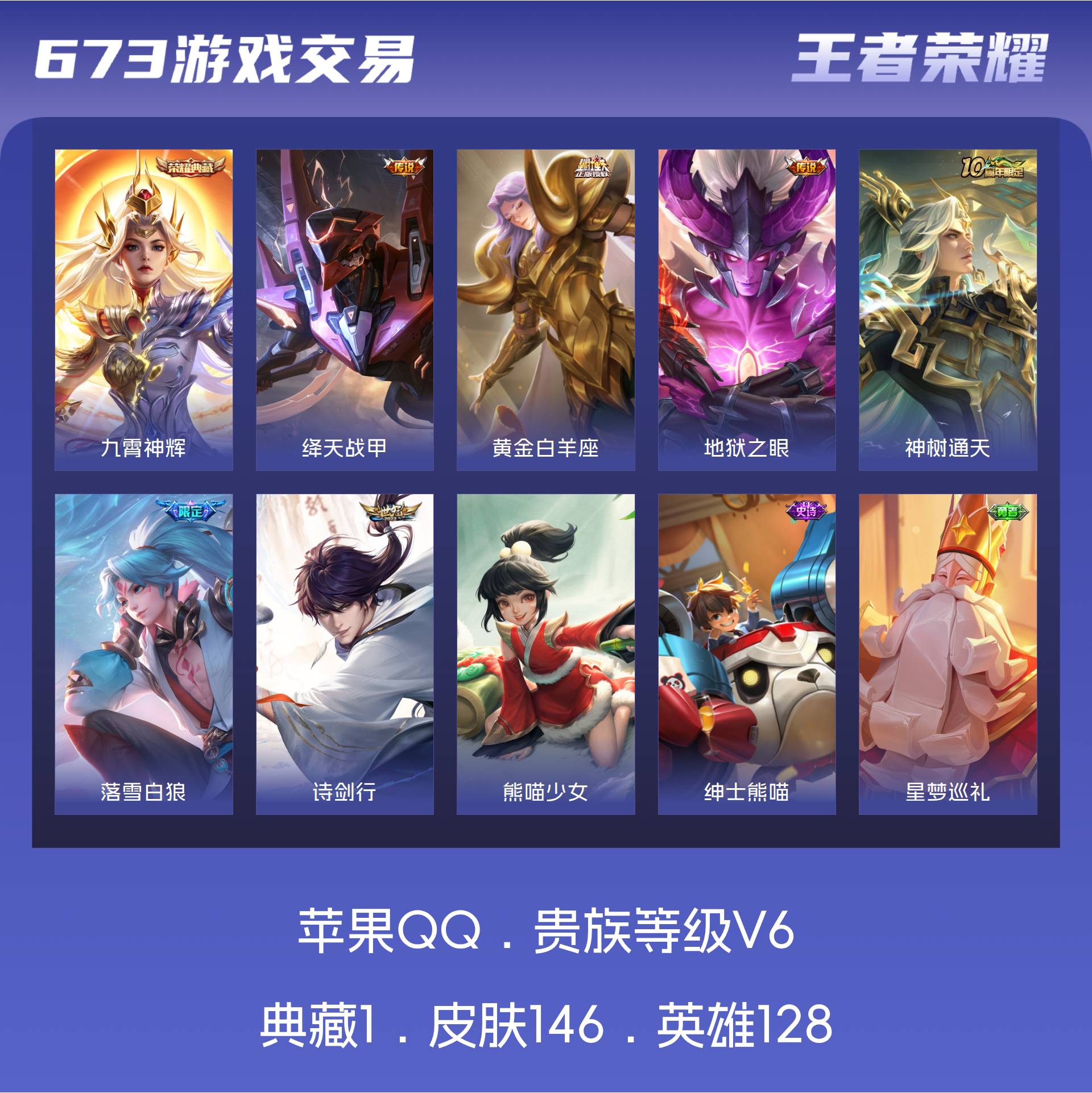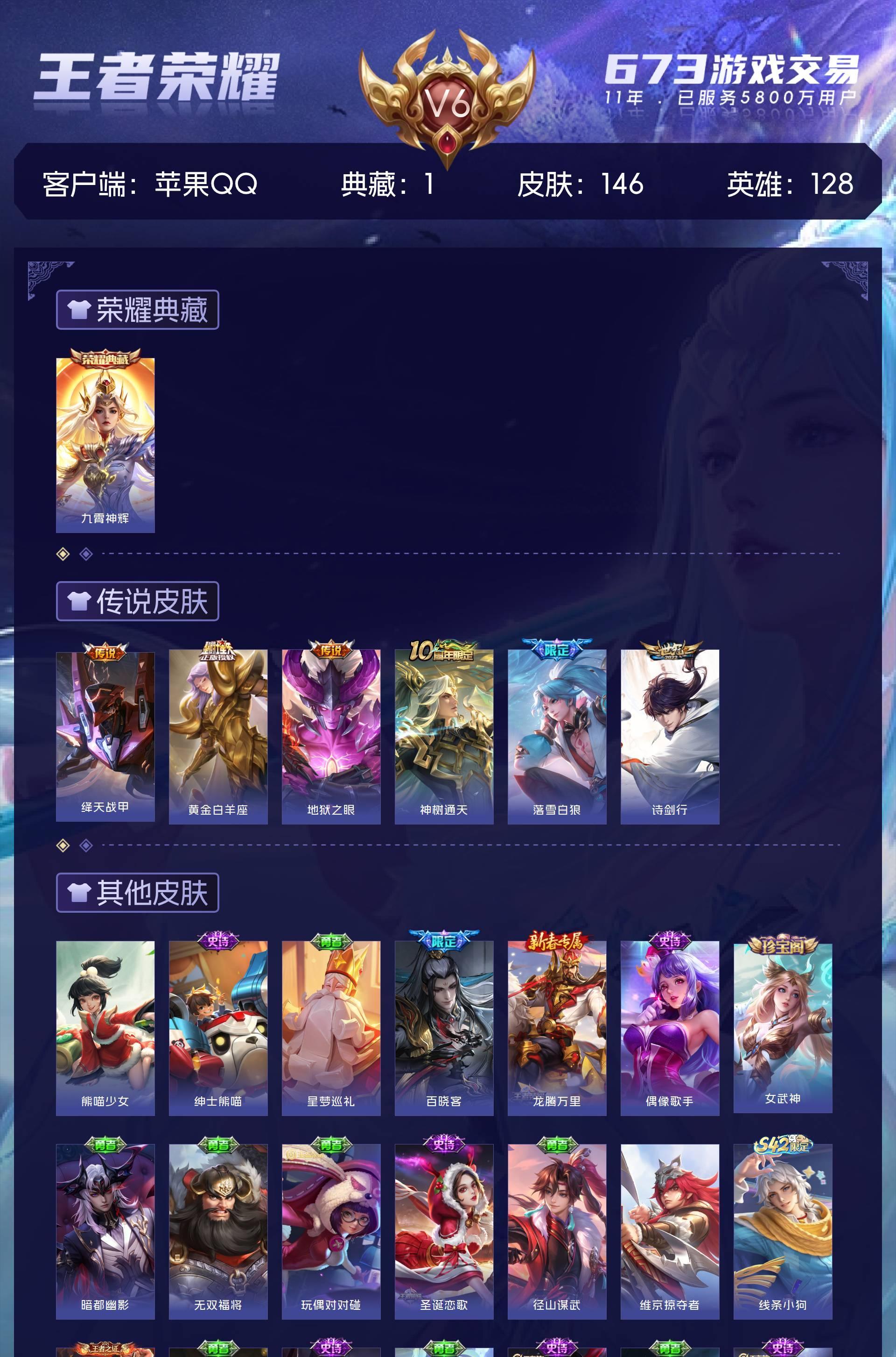 V6 皮肤146 英雄128 最强王者 荣耀典藏1 星传说2 传说6