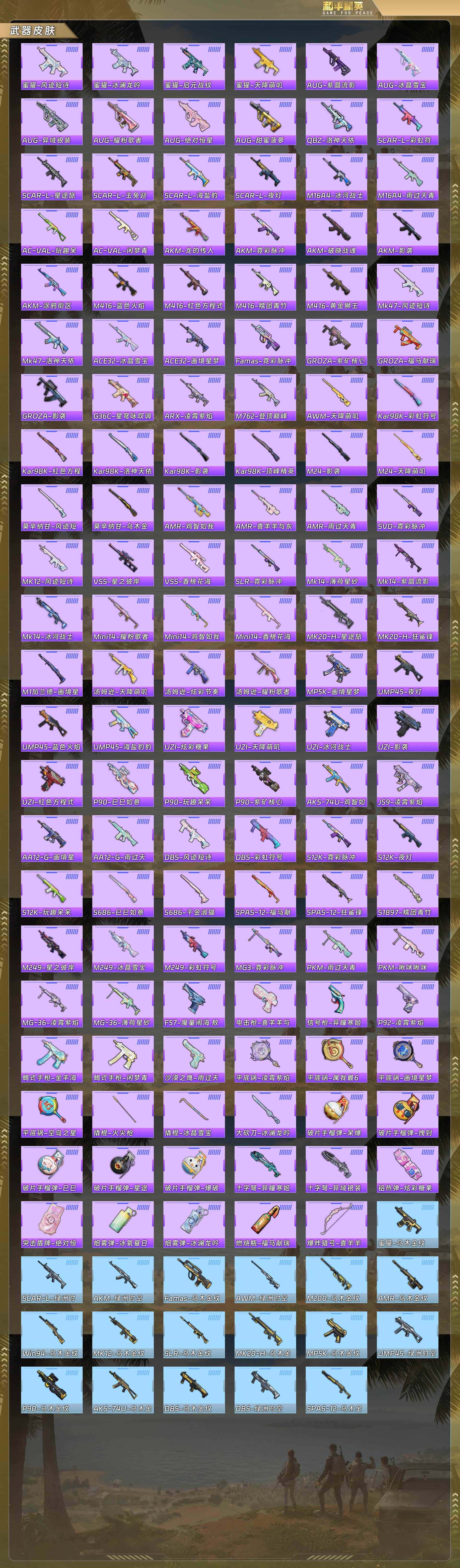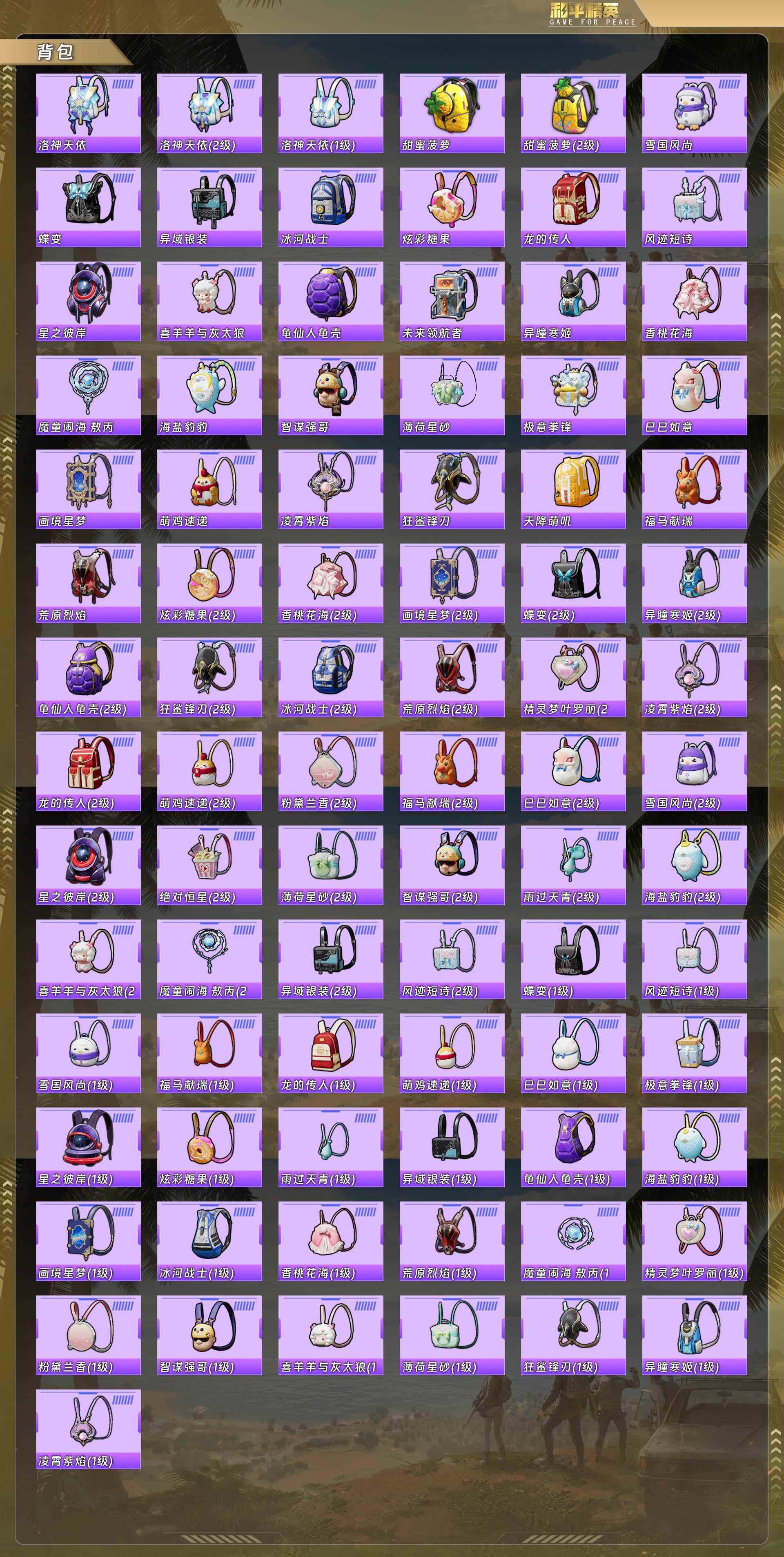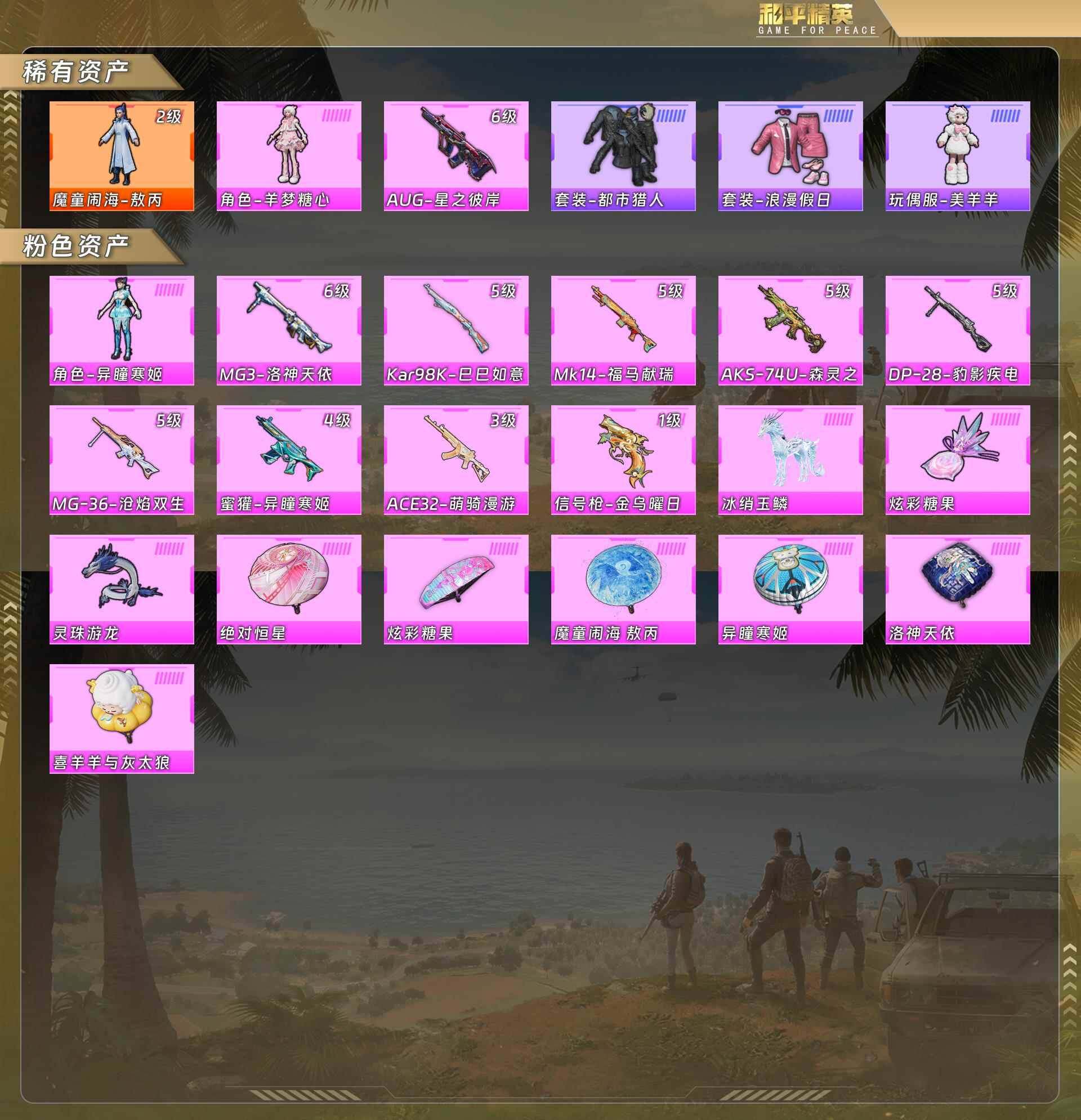 身法号-魔童闹海-敖丙[2级]/羊梦糖心/AUG-星之彼岸[6级]/都市猎人/浪漫假日/MG3-洛神天依[6级]/Kar98K-巳巳如意[5级]/Mk14-福马献瑞[5级]/AKS-74U-森灵之息[5级]/DP-28-豹影疾电[5级]/MG-36-沧焰双生[5级]/蜜獾-异瞳寒姬[4级]/ACE32-萌骑漫游[3级]/信号枪-金乌曜日[1级]冰绡玉鳞/没有战神框hp6447