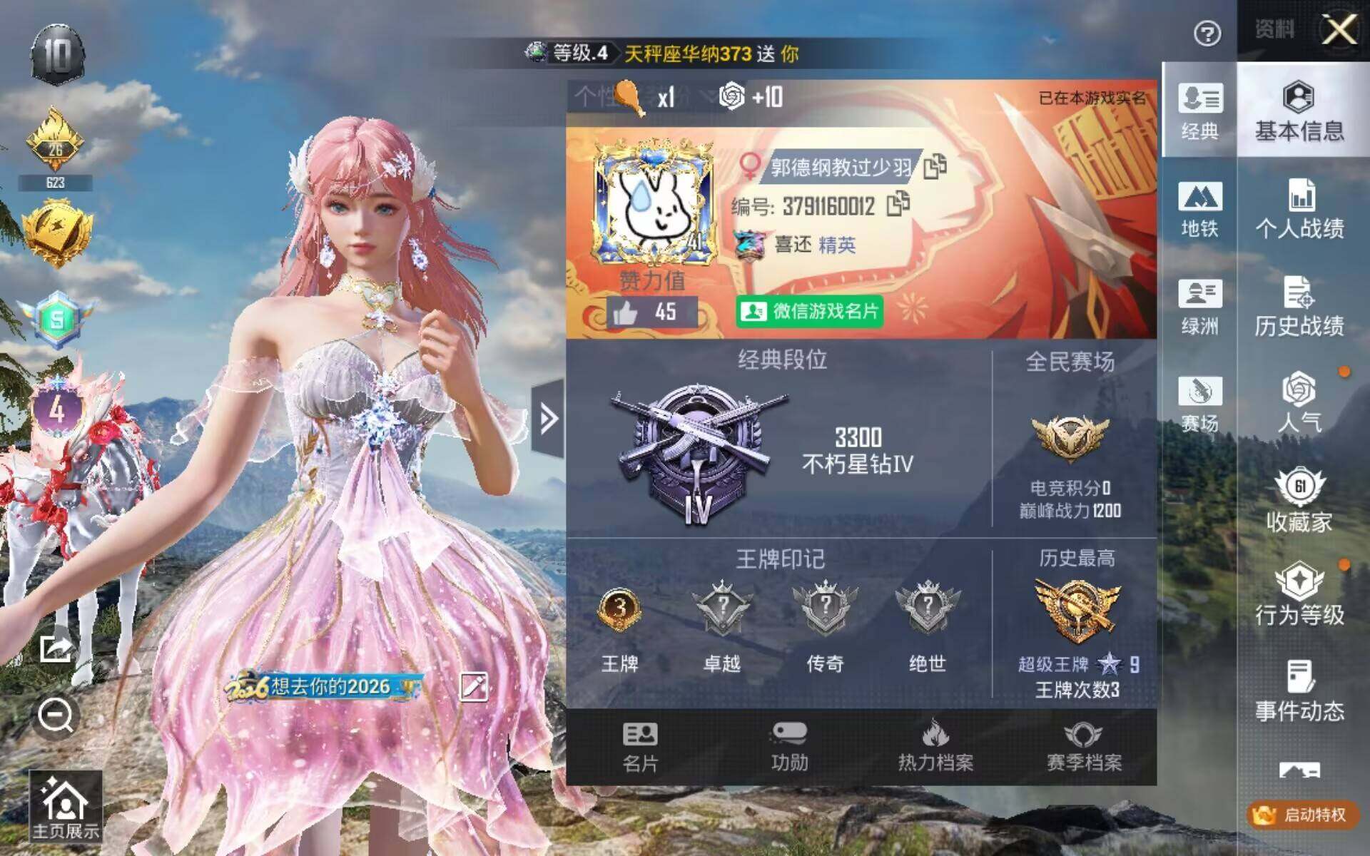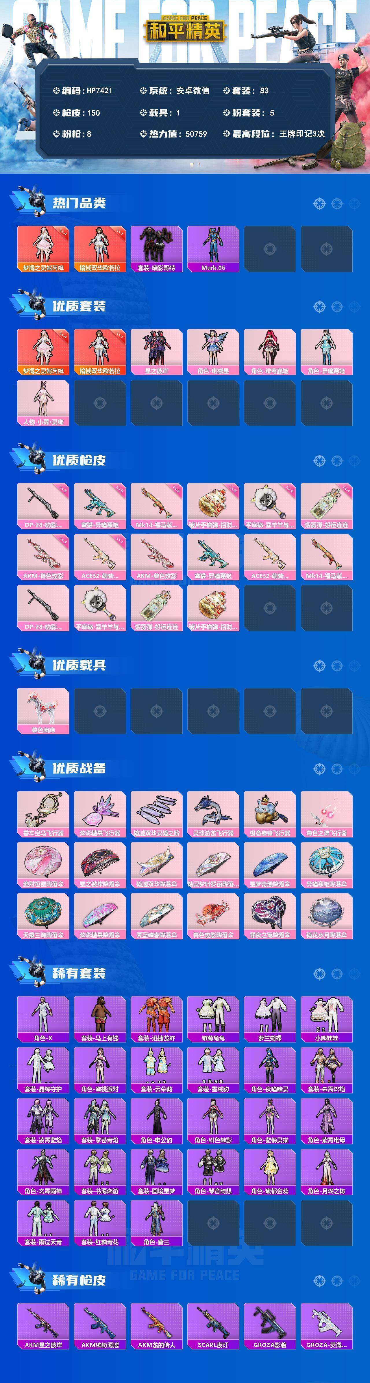 安卓 微信-2神装-5粉装-8特效枪-1载具-6粉色飞行器-50759热力值-3王牌印记-83套装-150枪皮