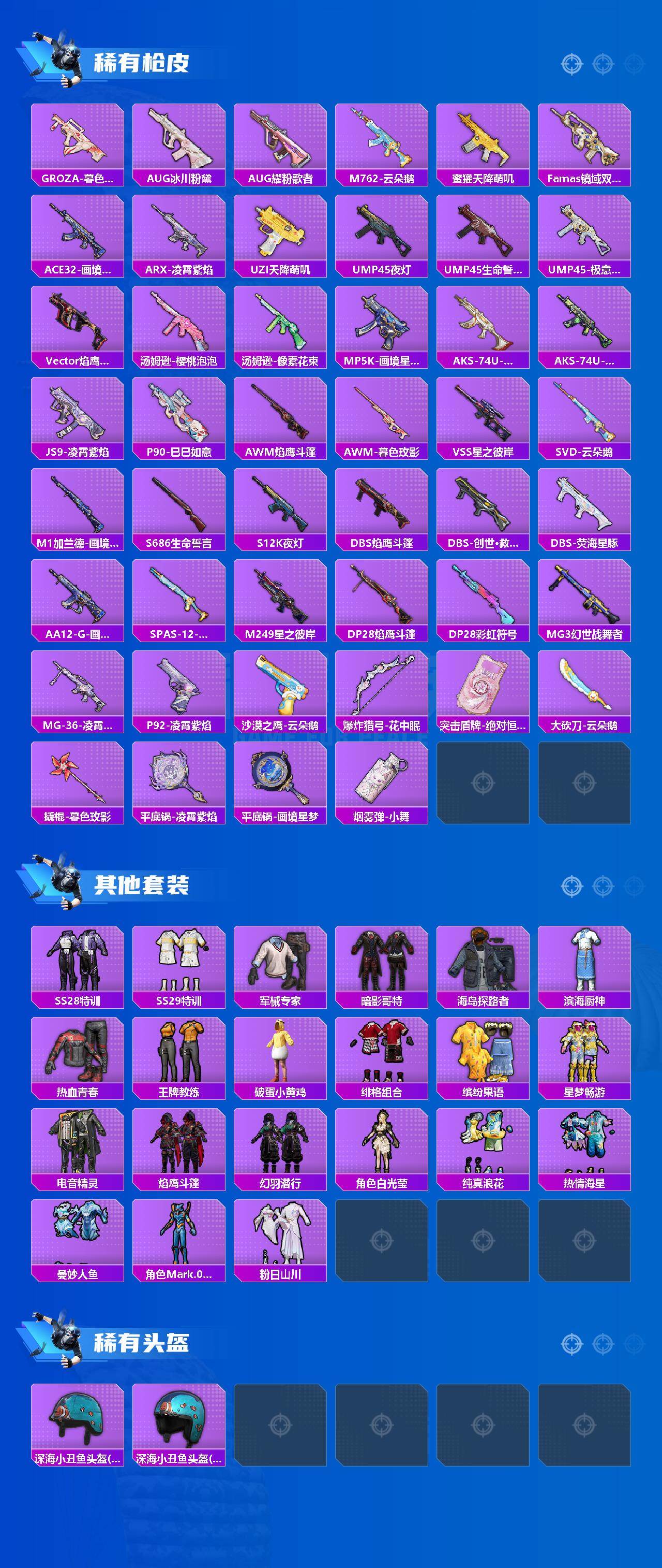 【粉色枪皮等级】:AKM-暮色玫影(三级),蜜獾-异瞳寒姬(五级),ACE32-萌骑漫游(一级),Mk14-福马献瑞(