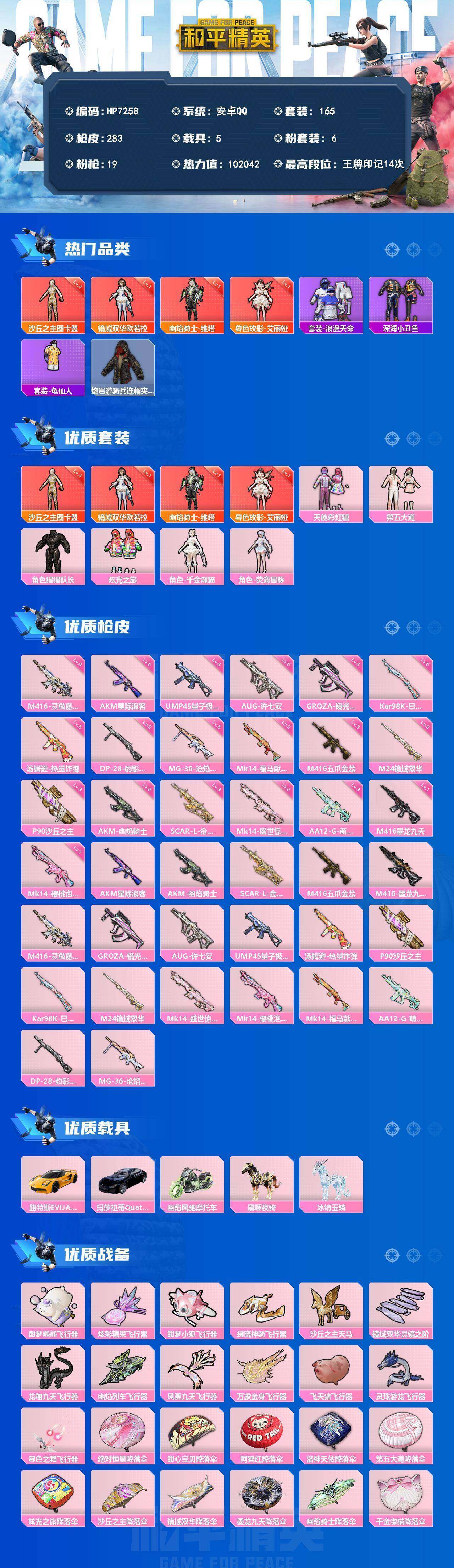 素材号-地铁满天赋-沙丘之主图卡盟4级/幽焰骑士维塔/镜域双华欧若拉/暮色玫影艾丽娅/第五大道/M4灵猫魔法师9级/AUG许七安5级/M416五爪金龙3级/M4墨龙九天/熔岩游骑兵面罩/深海小丑鱼/浪漫天命/狂沙舞者/P90沙丘之主3级/Mk14樱桃泡泡/玛莎拉蒂(夜幕蓝)/黑曜夜骑/冰绡玉鳞/路特斯EVIJA(星际黄)/幽焰风驰摩托车-没战神框(4红装6粉装19粉枪5载具)HP7258-14粉色飞行器-102042热力值-14王牌印记-165套装-283枪皮