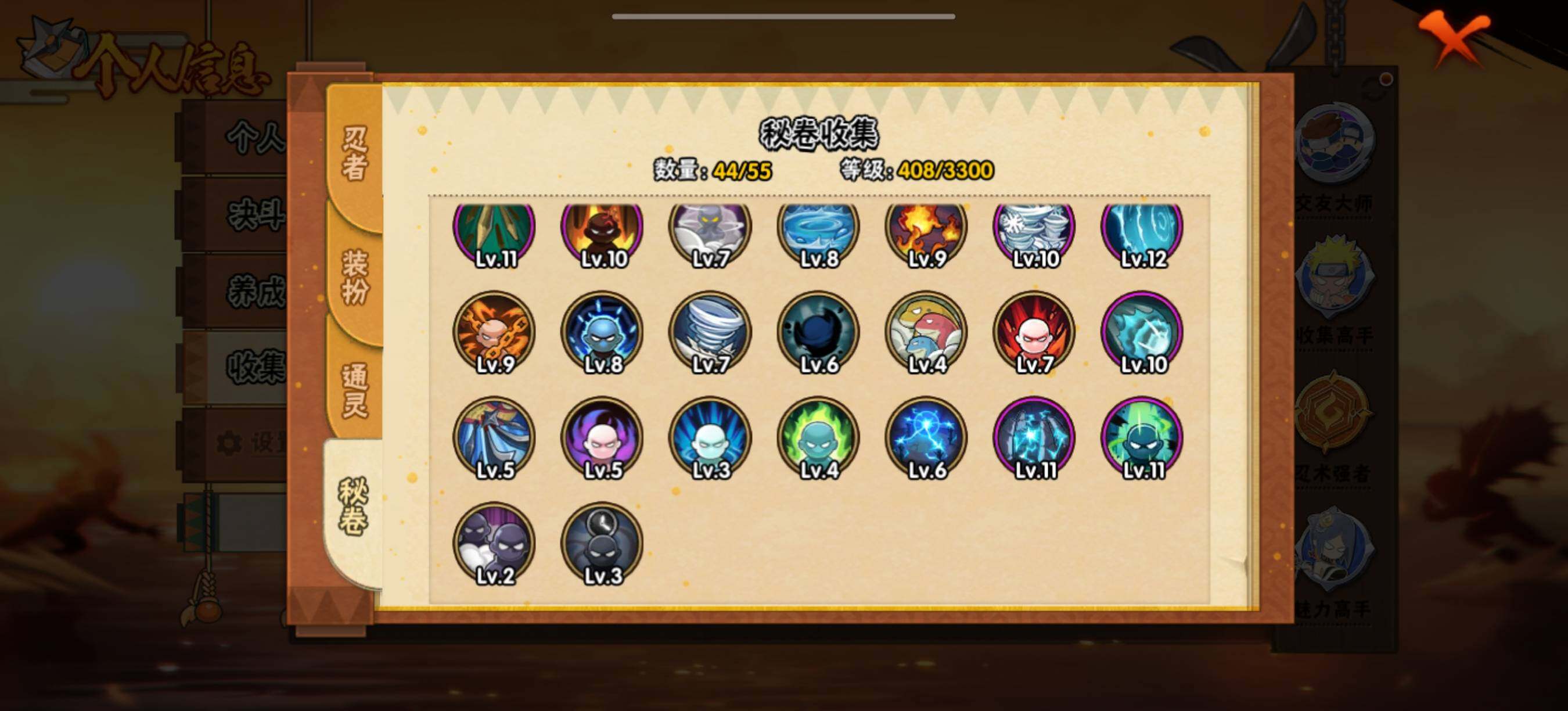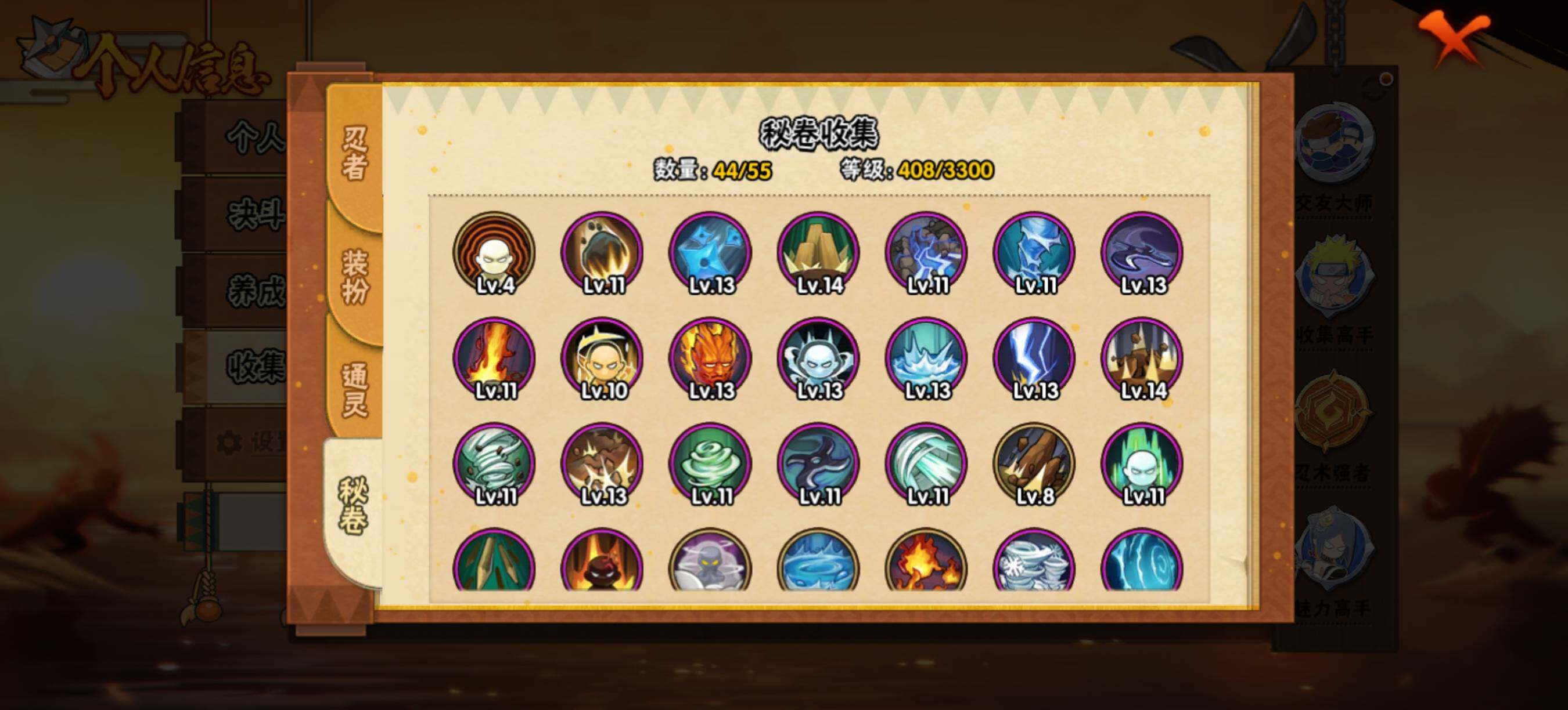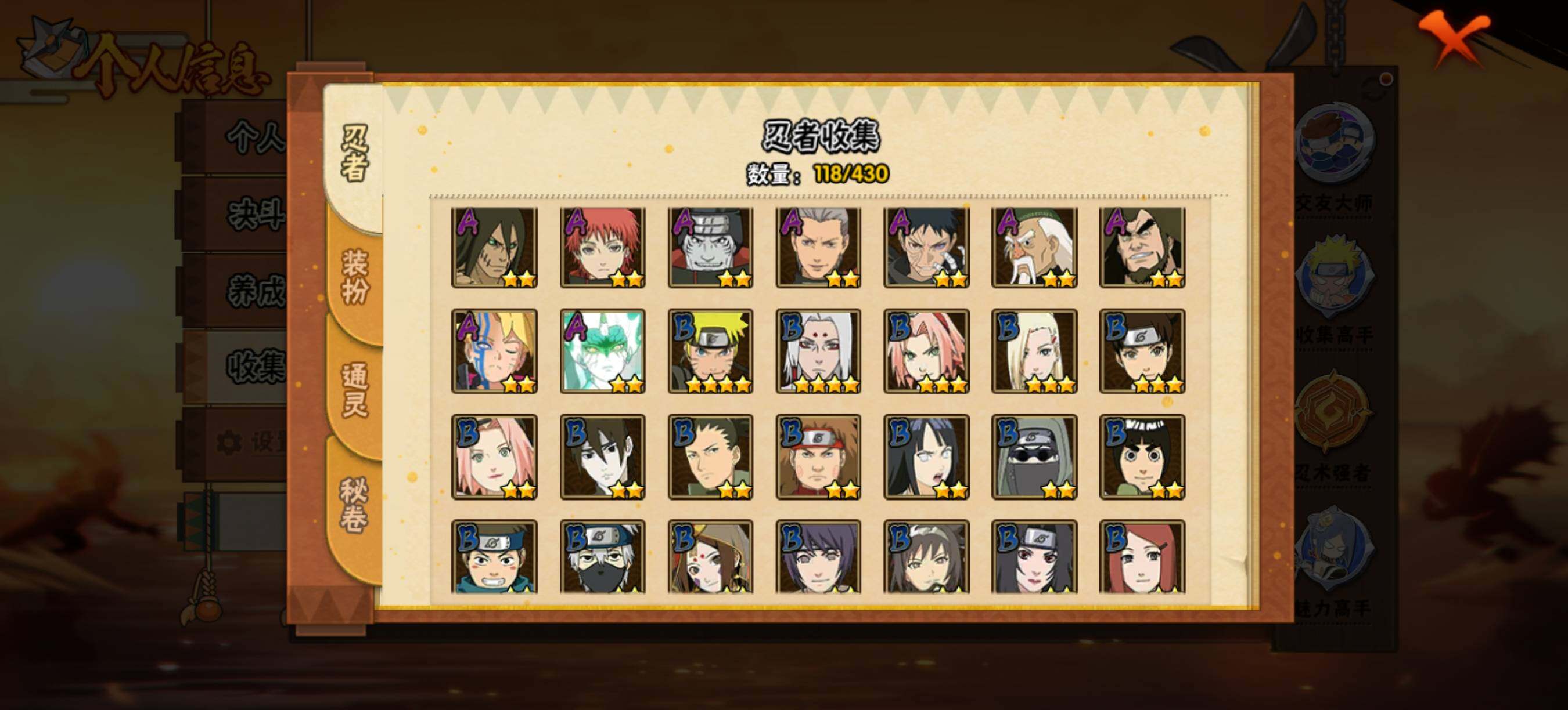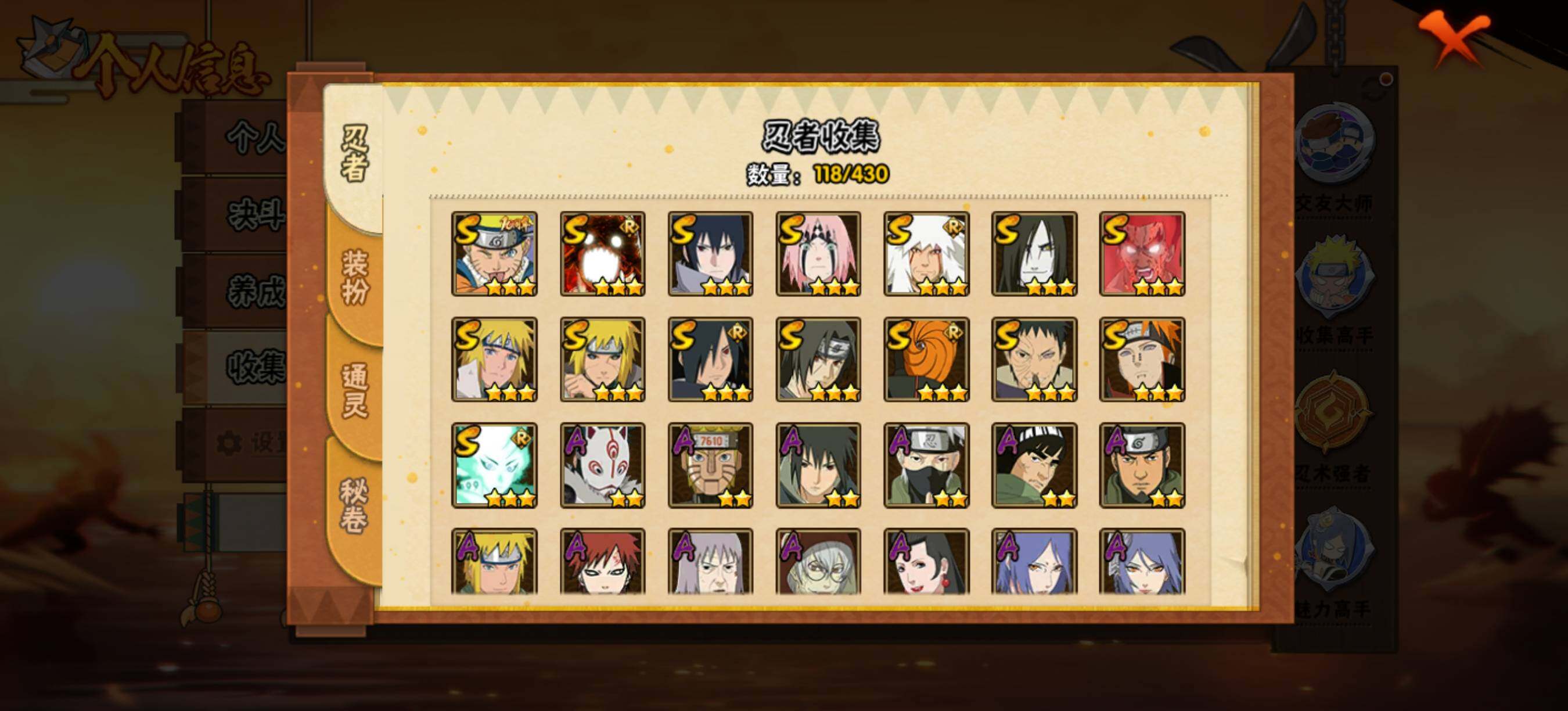 【S级忍者】:波风水门「秽土转生」(3星),春野樱「忍界大战」(3星),宇智波带土「忍界大战」(3星),宇智波鼬「须佐能乎」(3星),宇智波斑「木叶创立」(3星),自来也「舞之豪杰」(3星),大蛇丸(3星),波风水门(3星),迈特凯「死门」(3星),佩恩「天道」(3星),宇智波佐助「永恒万花筒」(3星),大筒木舍人「最终章」(3星),漩涡鸣人「暴怒·第六尾」(3星),宇智波斑「五影会谈」(3星),漩涡鸣人·宇智波佐助(3星)