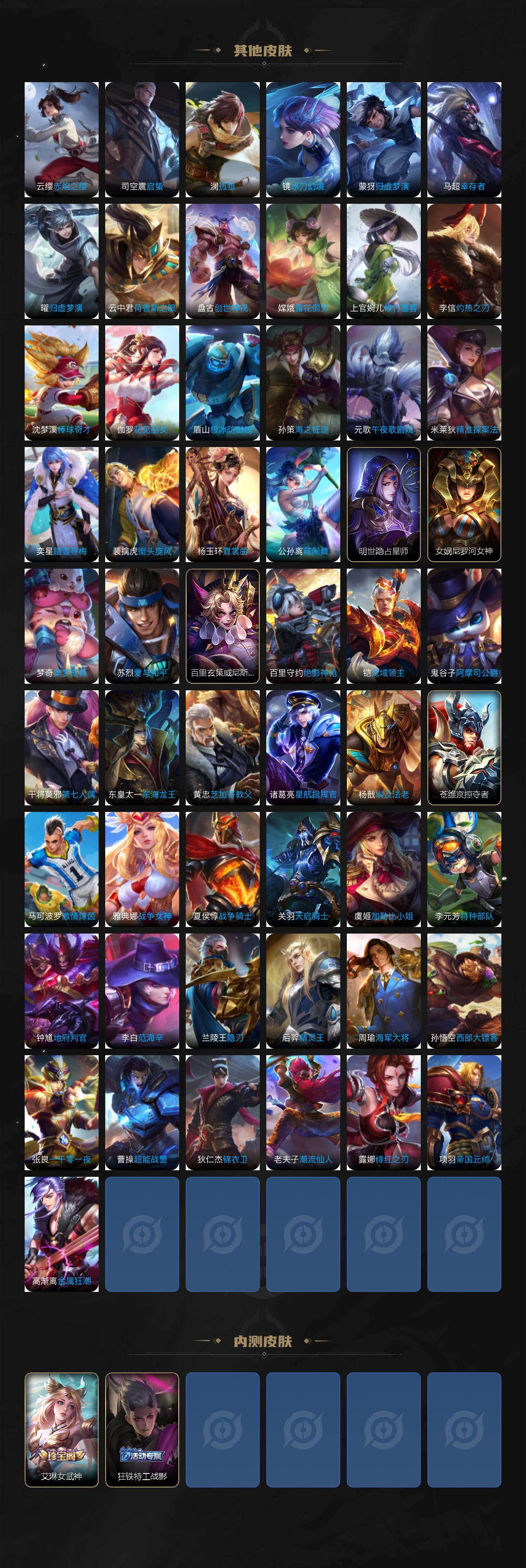 贵族等级4/传说皮肤数量4/史诗皮肤数量52/皮肤数量232/英雄数量127/段位尊贵铂金/怒海麟威 吕布/深海之息 马可波罗/零号·赤焰 孙悟空/久胜战神 干将莫邪/狰 白起/阴阳师 狄仁杰/皇家上将 赵云/引擎之心 赵云/白昼王子 嬴政/重明 芈月/猎兽之王 吕布/赤莲之焰 周瑜/无心 元歌/朔风刀 夏侯惇/游园惊梦 甄姬/烛龙 曹操/穷奇 典韦/暗影游猎 马可波罗/魔术师 狄仁杰/万华元