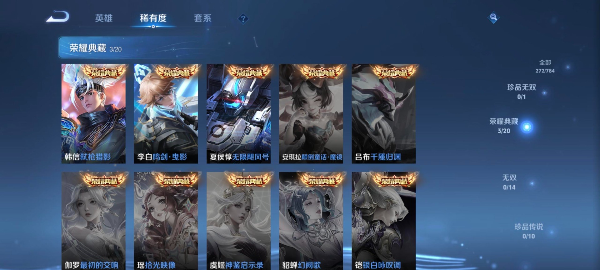 【稀有英雄】大司命,敖隐(小龙人),夏洛特(夏师傅),金蝉(唐僧),戈娅,赵云,嬴政(始皇帝),韩信(韩跳跳),艾琳,不知火舞,娜可露露(鸟人),橘右京(橘子)