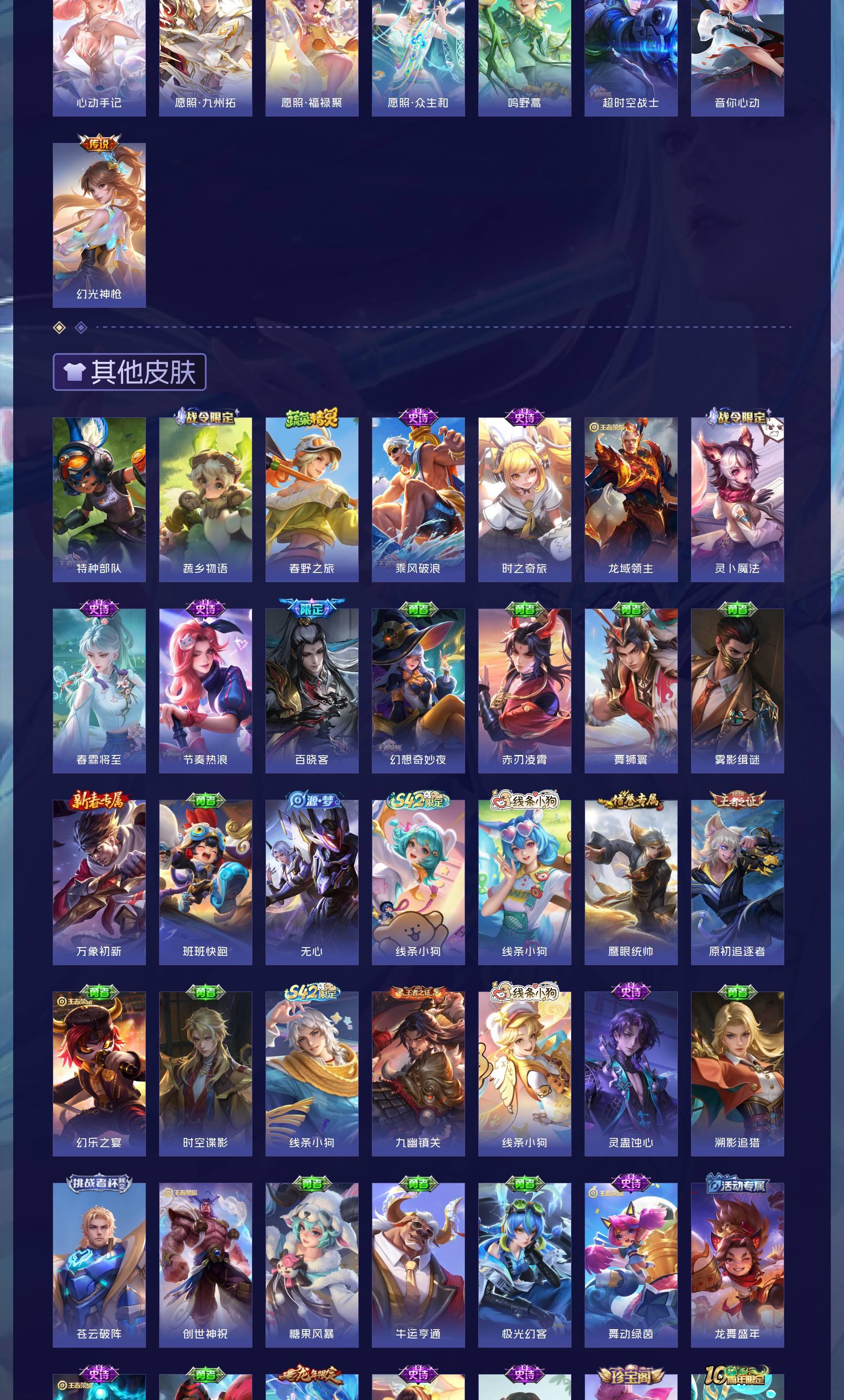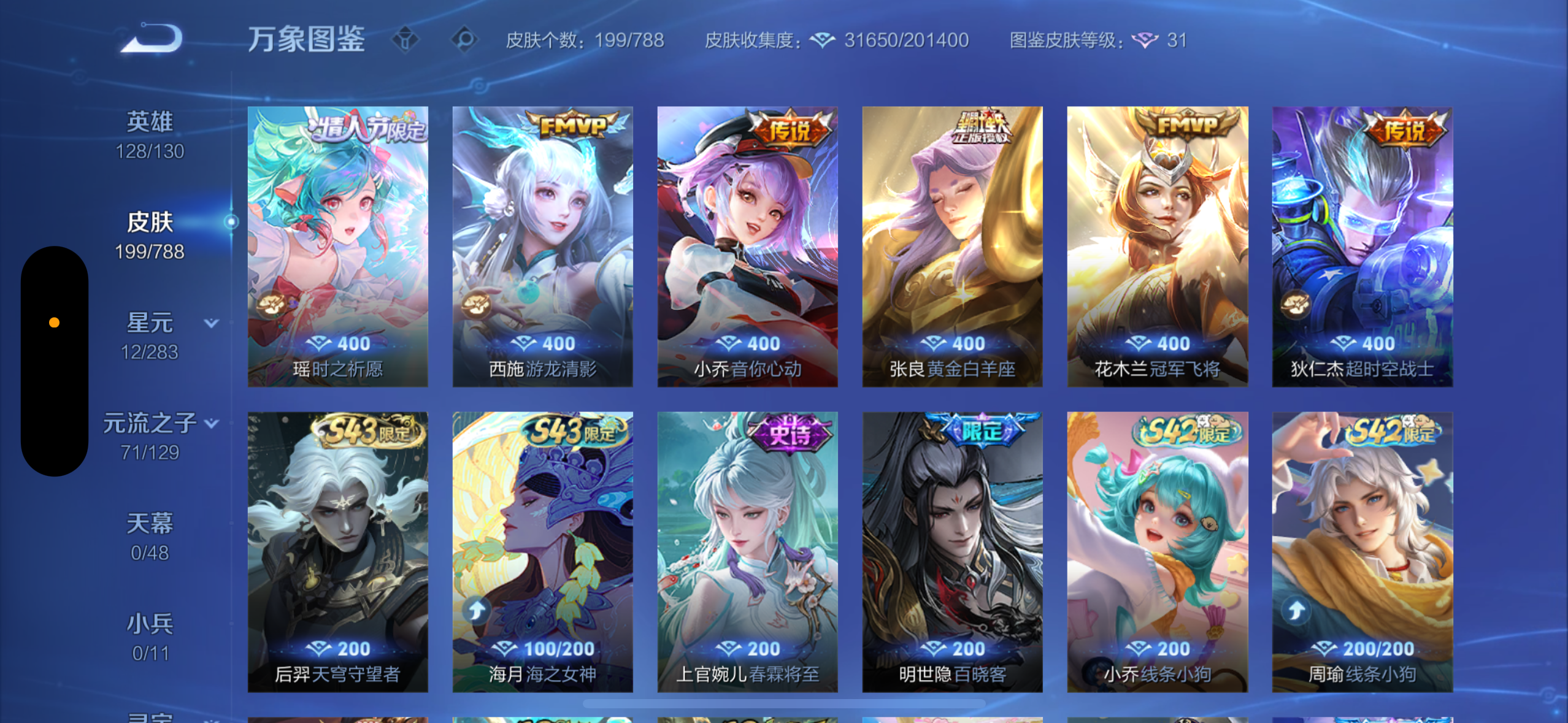 V7 皮肤199 英雄128 至尊星耀 荣耀典藏1 无双皮肤1 珍品传说1 传说15