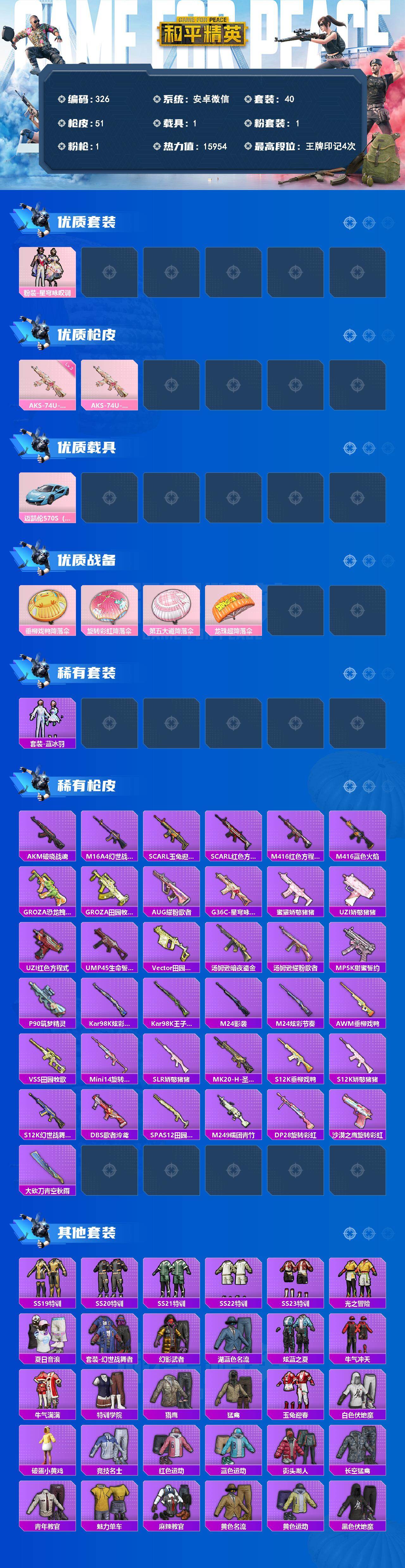 HJ6752 可二 53级 1载具1粉装1特效枪40套装51枪皮4印记【1载具】 迈凯伦570S天际蓝 【1粉装】 星穹咏叹调 【1特效枪】 AKS-74U-星穹咏叹调 (3级) 【1热门】 破蛋小黄鸡 【1背包】 梦幻火箭背包