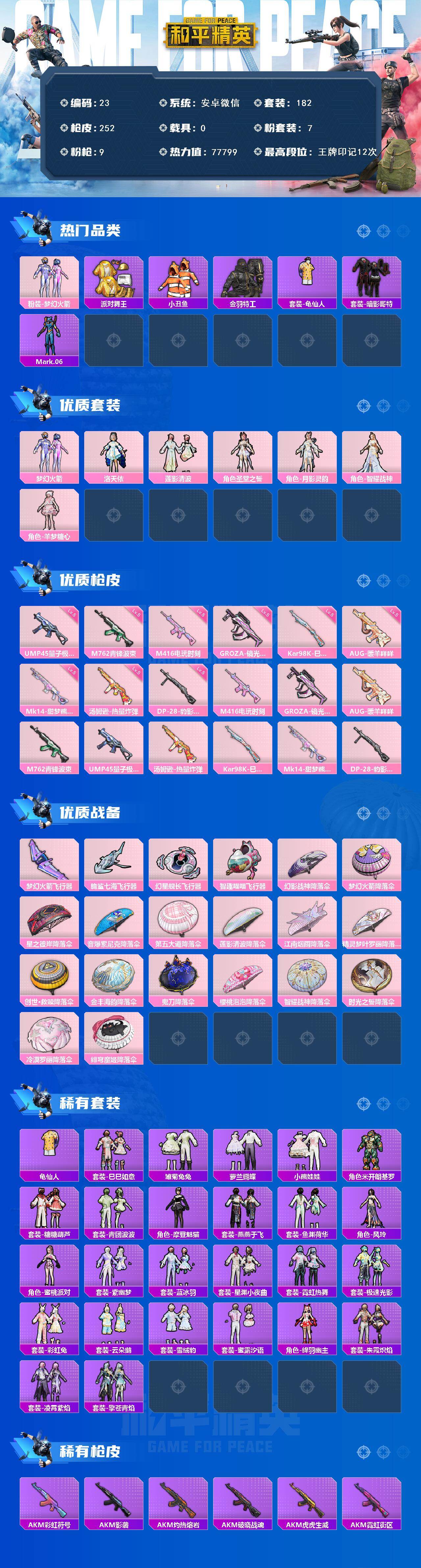 HJ4949 可二 游戏63级 7粉9特 182套装251枪皮 【2稀有】 派对舞王 派对舞王(金靴子) 【7粉装】 圣堂之誓 梦幻火箭 洛天依 月影灵韵 羊梦糖心 智耀战神 莲影清波 【9特效枪】 M416-电玩时刻 (5级) Kar98K-巳巳如意 (5级) M762-青锋波束 (5级) DP-28-豹影疾电 (5级) AUG-暖羊咩咩 (5级) UMP45-量子极限 (5级) Mk14-甜梦熊击 (5级) GROZA-镜光银凌 (5级) 汤姆逊-热量炸弹 (5级) 【9热