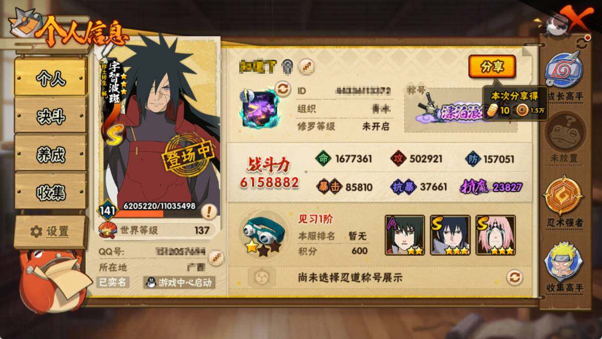V8/战力615W/S忍8/A忍26/2星宇智波带土「漂泊浪