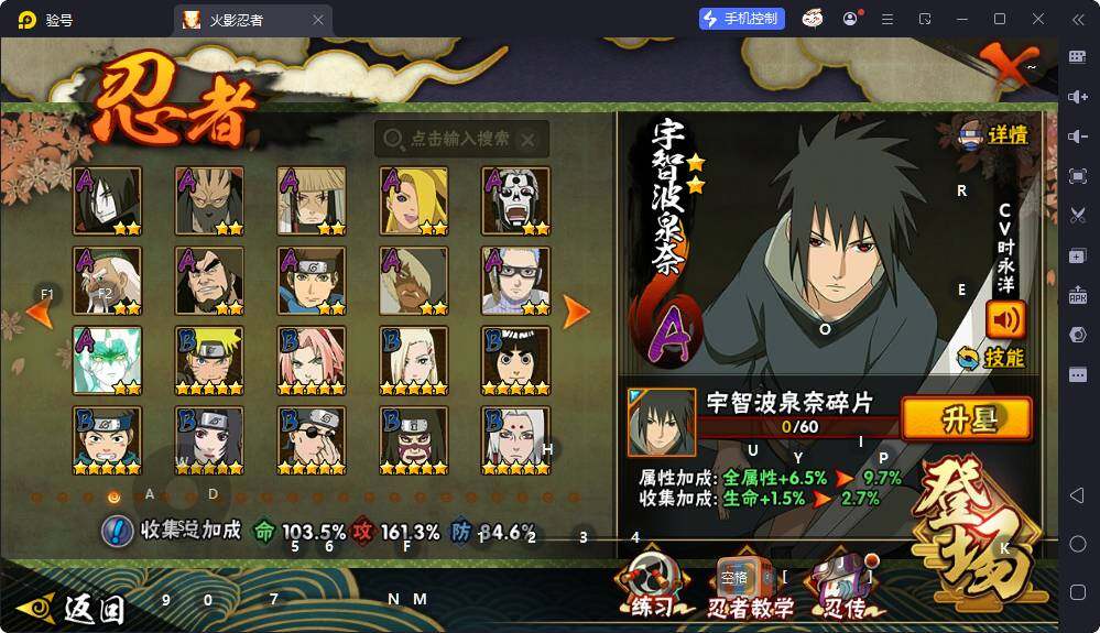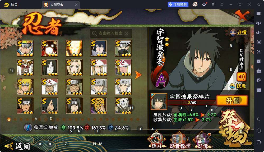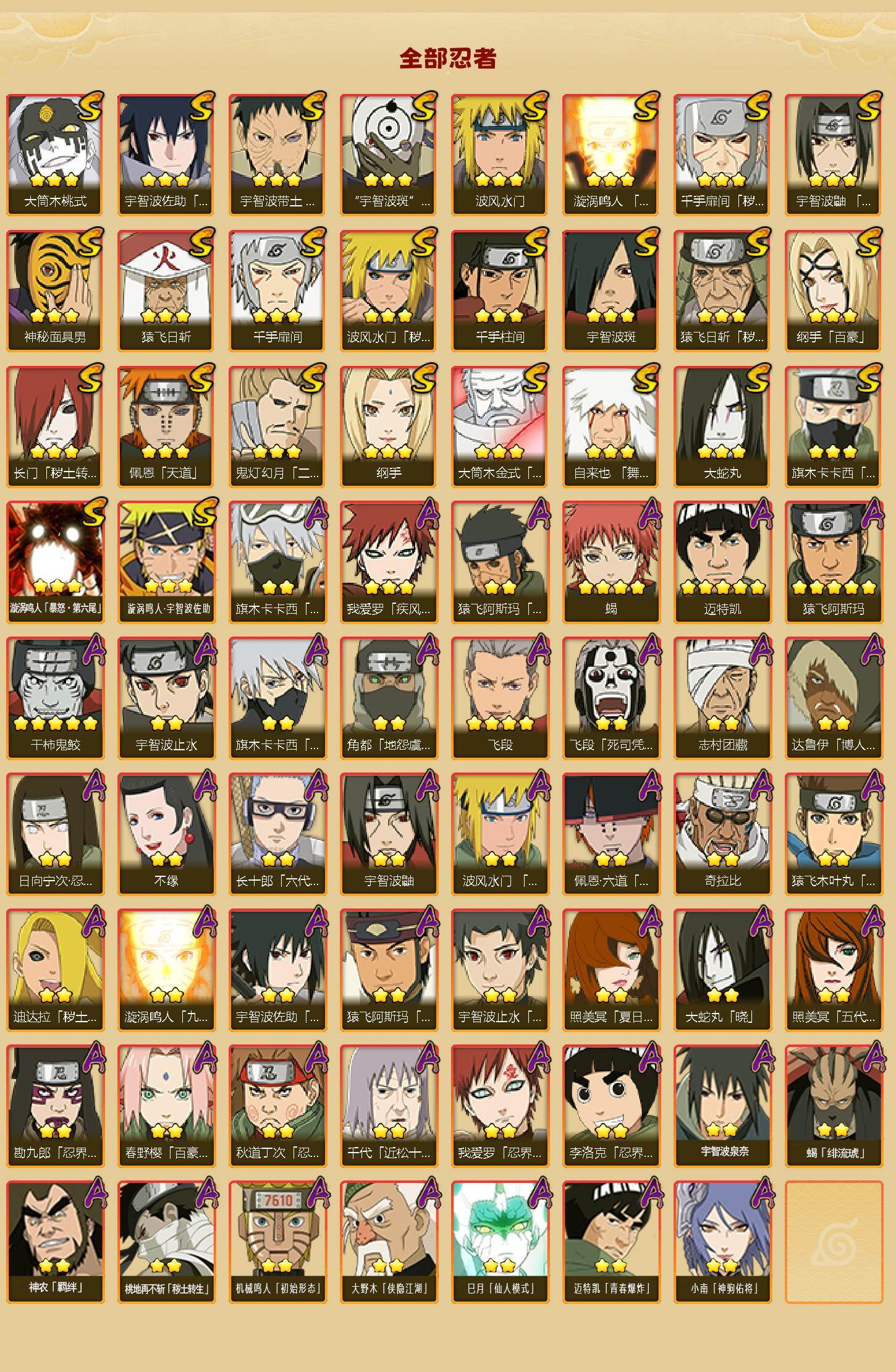 【S级忍者】:长门「秽土转生」(3星),猿飞日斩「秽土转生」(3星),波风水门「秽土转生」(3星),千手扉间「秽土转生」(3星),宇智波带土「忍界大战」(3星),宇智波鼬「须佐能乎」(3星),旗木卡卡西「须佐能乎」(3星),鬼灯幻月「二代目水影」(3星),自来也「舞之豪杰」(3星),大蛇丸(3星),纲手(3星),纲手「百豪」(3星),千手柱间(3星),千手扉间(3星),猿飞日斩(3星),宇智波斑(3星),波风水门(3星),神秘面具男(3星),漩涡鸣人「九喇嘛连结」