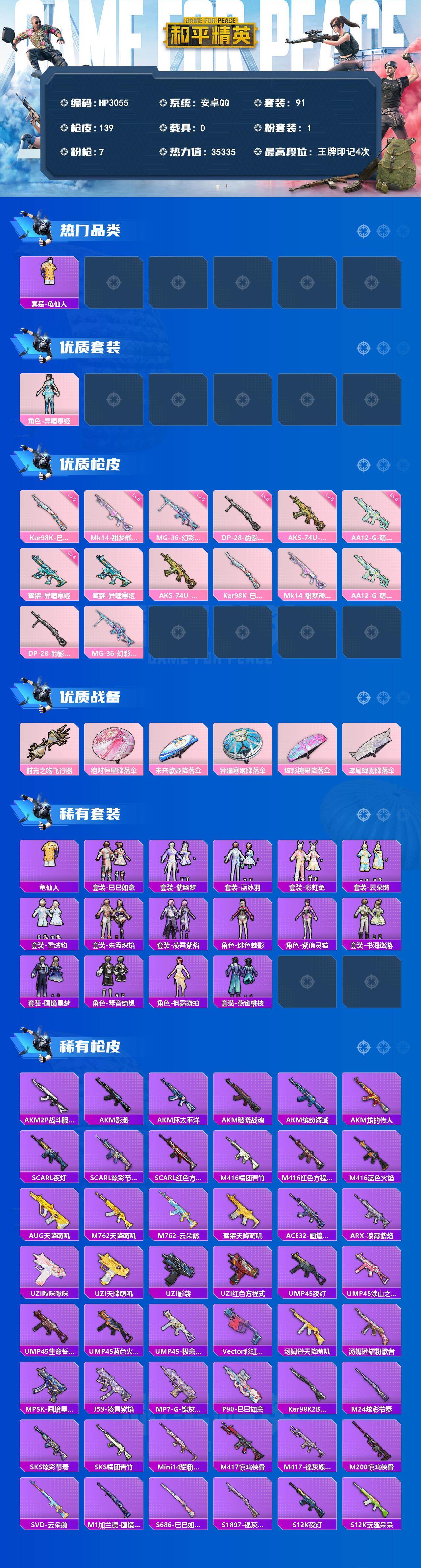 【HP3055】91套装/枪械7/装备120/战备83/王牌印记4/热力值35335/四级蜜獾-异瞳寒姬/五级AKS-74U-森灵之息/五级Kar98K-巳巳如意/五级Mk14-甜梦熊击/五级AA12-G-萌骑幻想/五级DP-28-豹影疾电/五级MG-36-幻彩电音/套装-龟仙人/角色-异瞳寒姬/蜜獾-异瞳寒姬/AKS-74U-森灵之息/Kar98K-巳巳如意/Mk14-甜梦熊击/AA12-G-萌骑幻想/DP-28-豹影疾电/MG-36-幻彩电音/时光之吻飞行器/绝对恒星降落伞/未来歌姬降落伞/