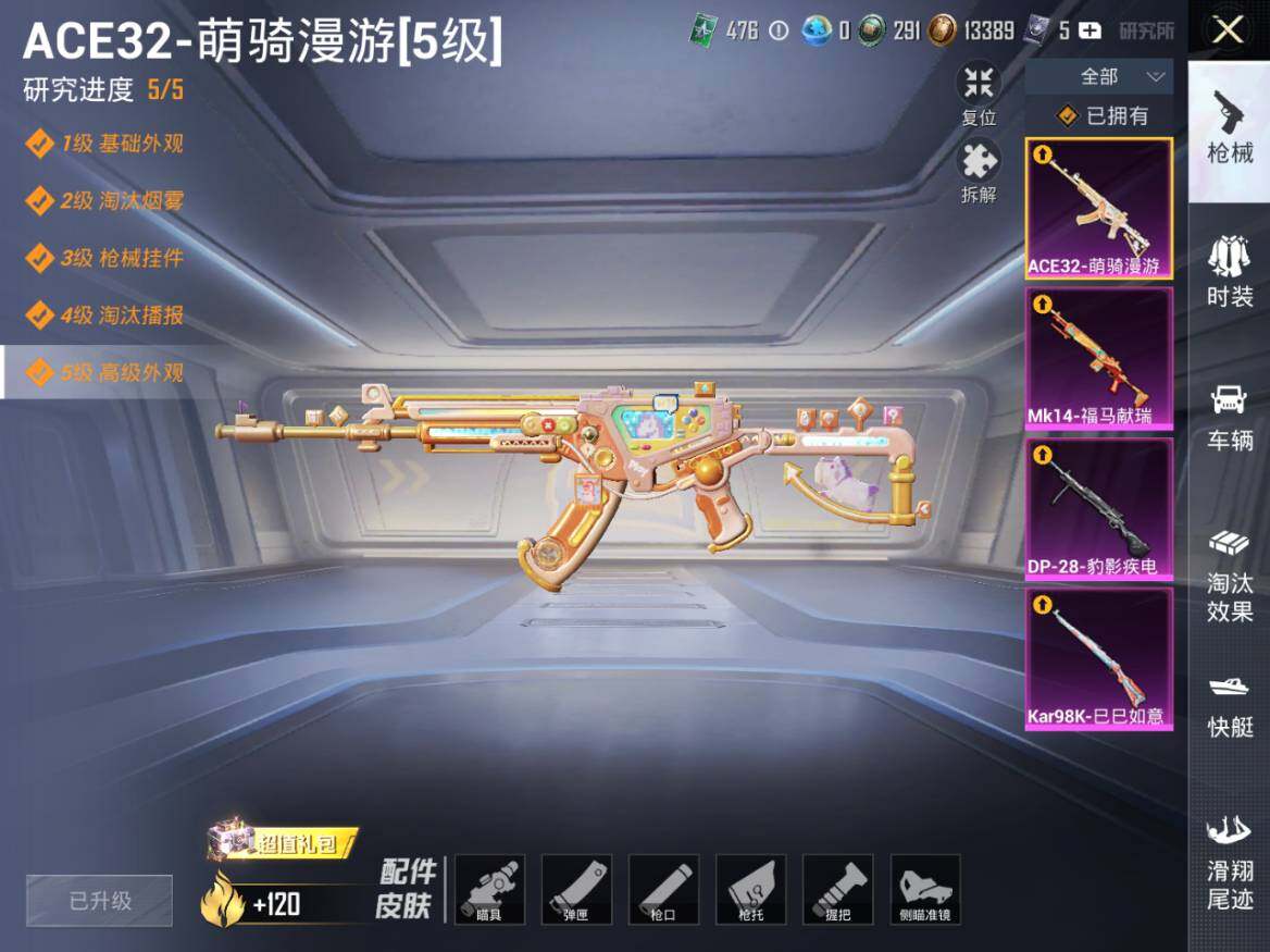 【粉色枪皮等级】:ACE32-萌骑漫游(五级),Kar98K-巳巳如意(五级),Mk14-福马献瑞(五级),DP-28-豹影疾电(五级)