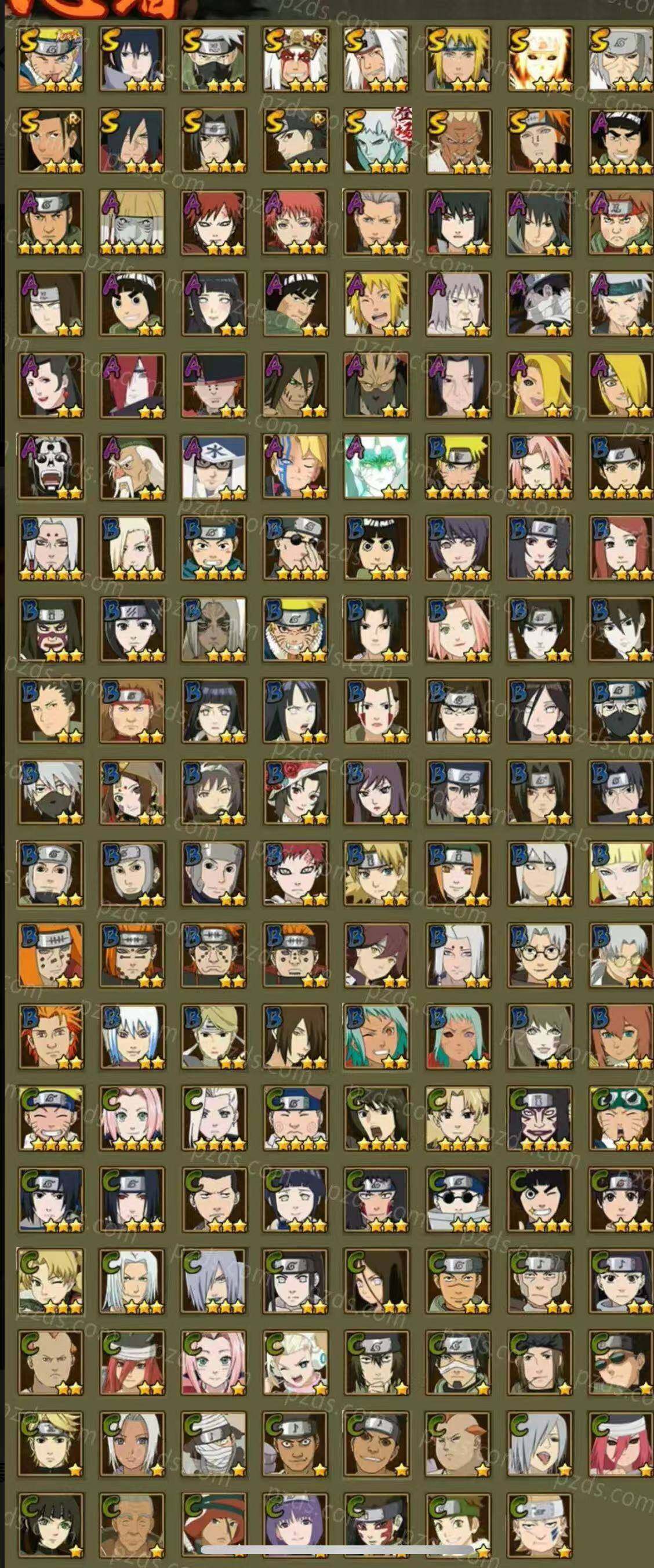 【S级忍者】:千手扉间「秽土转生」(3星),宇智波斑「秽土转生·解」(3星),艾「忍界大战」(3星),宇智波鼬「须佐能乎」(3星),宇智波止水「须佐能乎」(3星),旗木卡卡西「须佐能乎」(3星),千手柱间「木叶创立」(3星),自来也「舞之豪杰」(3星),自来也「传说中的三忍」(3星),波风水门(3星),佩恩「天道」(3星),宇智波佐助「永恒万花筒」(3星),波风水门「九喇嘛连结」(3星),漩涡鸣人·宇智波佐助(3星),宇智波带土「十尾人柱力」(3星)
