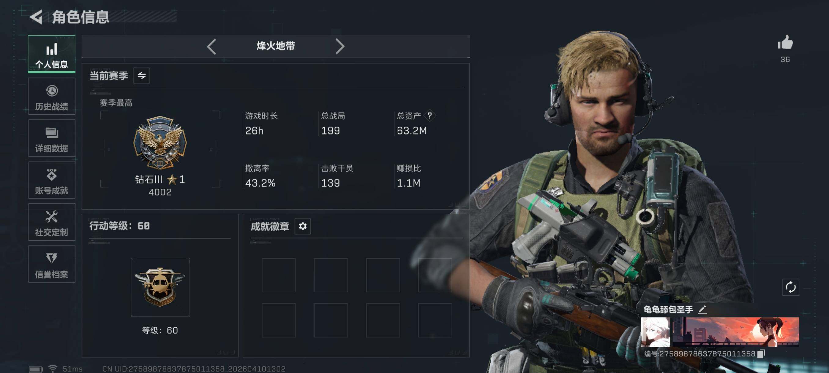 {特价出售}等级:60 总资产:63.2M 流动资产: 40 M 纯币: 869183 战令皮肤: 露娜-金牌射手/威龙-壮志凌云 刀皮:近战-赤枭/近战-影锋 特勤处:仓库7,训练7,靶场7