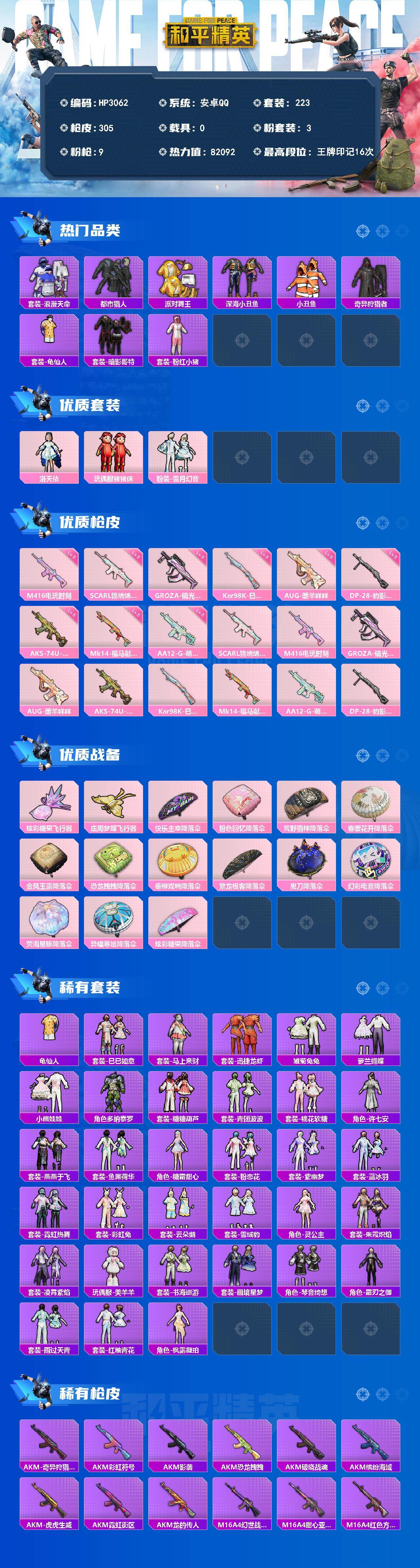 【HP3062】223套装/枪械9/装备371/战备250/王牌印记16/热力值82092/五级SCAR-L-锦绣绵绵/五级M416-电玩时刻/五级GROZA-镜光银凌/五级AUG-暖羊咩咩/五级AKS-74U-森灵之息/五级Kar98K-巳巳如意/五级Mk14-福马献瑞/五级AA12-G-萌骑幻想/五级DP-28-豹影疾电/套装-浪漫天命/套装-都市猎人/套装-派对舞王/套装-深海小丑鱼/套装-小丑鱼/套装-奇异狩猎者/套装-龟仙人/套装-暗影哥特/套装-粉红小猪/角色-洛天依/玩偶服-猪猪侠