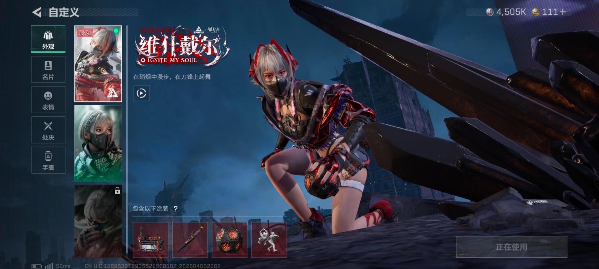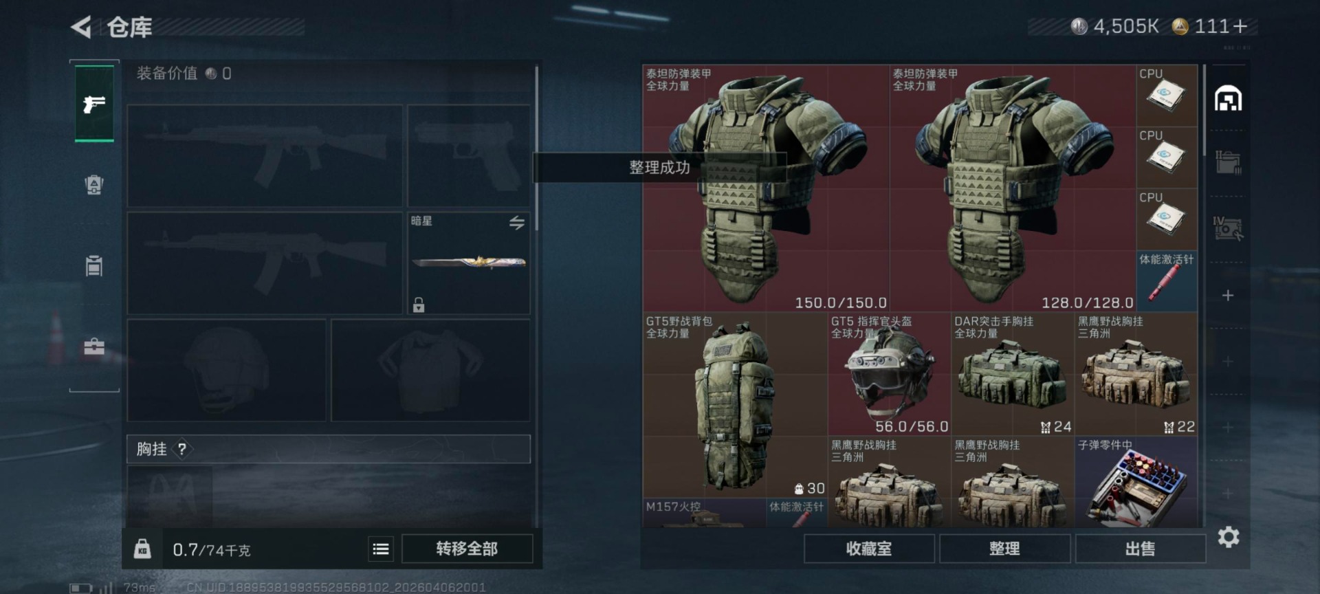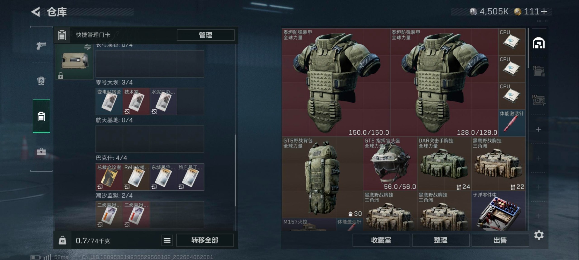 总资产:76M 4干员外观 4近战传说 25传说枪械 哈夫币:4.505K 可