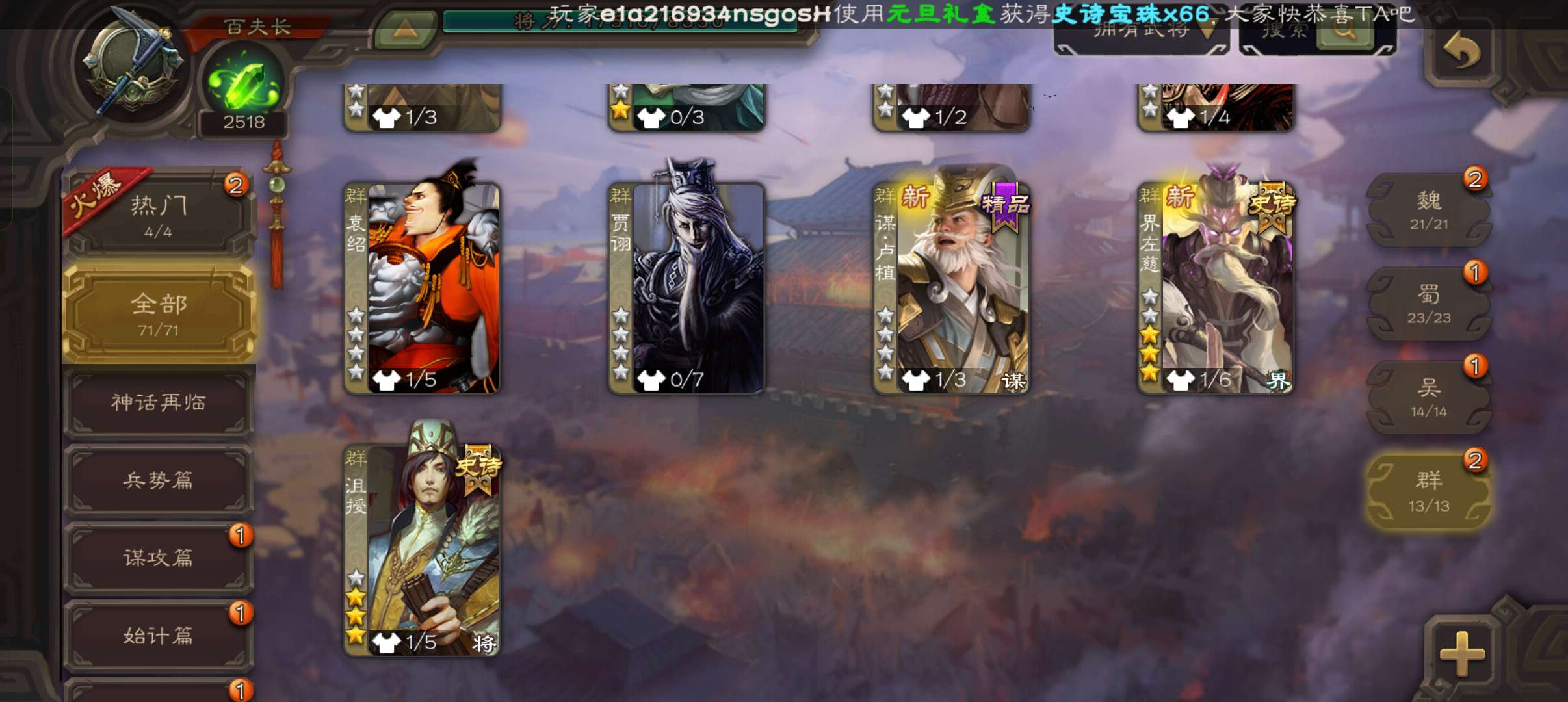 71将百夫长,2500将魂,真动态界左慈谯周沮授3史诗,骥李典谋卢植谋张郃甘夫人崔琰,145招募令