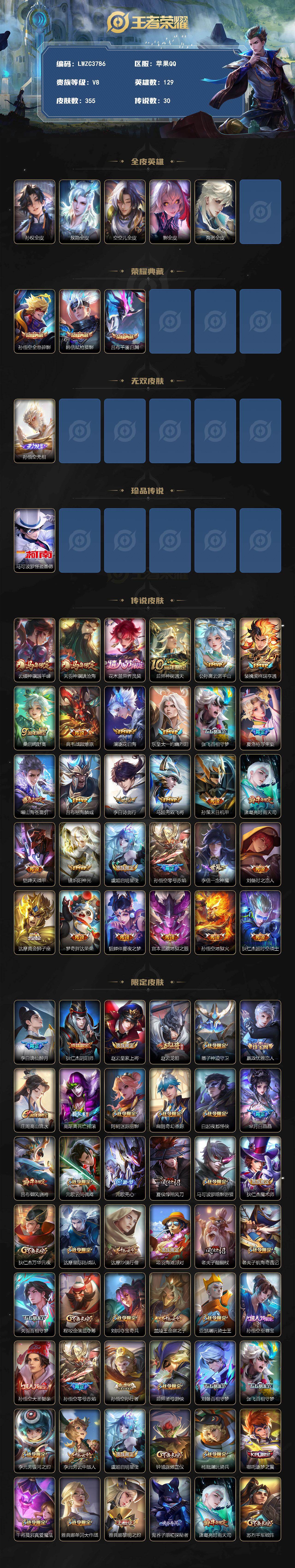 【特价急出/详情看图】苹果Q-V8-至尊星耀I段位-129英雄-355皮肤-3典藏皮肤-1无双-4星元-1珍品传说-30传说-105史诗【英雄全皮】:孙权全皮,敖隐全皮,空空儿全皮,影全皮,海诺全皮【荣耀典藏】:孙悟空全息碎影,韩信弑枪猎影,吕布千魇归渊【无双皮肤】:孙悟空无相【珍品传说】:马可波罗怪盗基德【传说皮肤】:云缨神骥越千峰,关羽神骥镇沧海,花木兰异界灵契,后羿神树通天,公孙离云诺千山,裴擒虎祥瑞亨通,桑启鸣野蒿,典韦战鼓燎原,澜逐花归海,东皇太一灼幽烈阳,张飞百相守梦,夏洛特浮生妄,