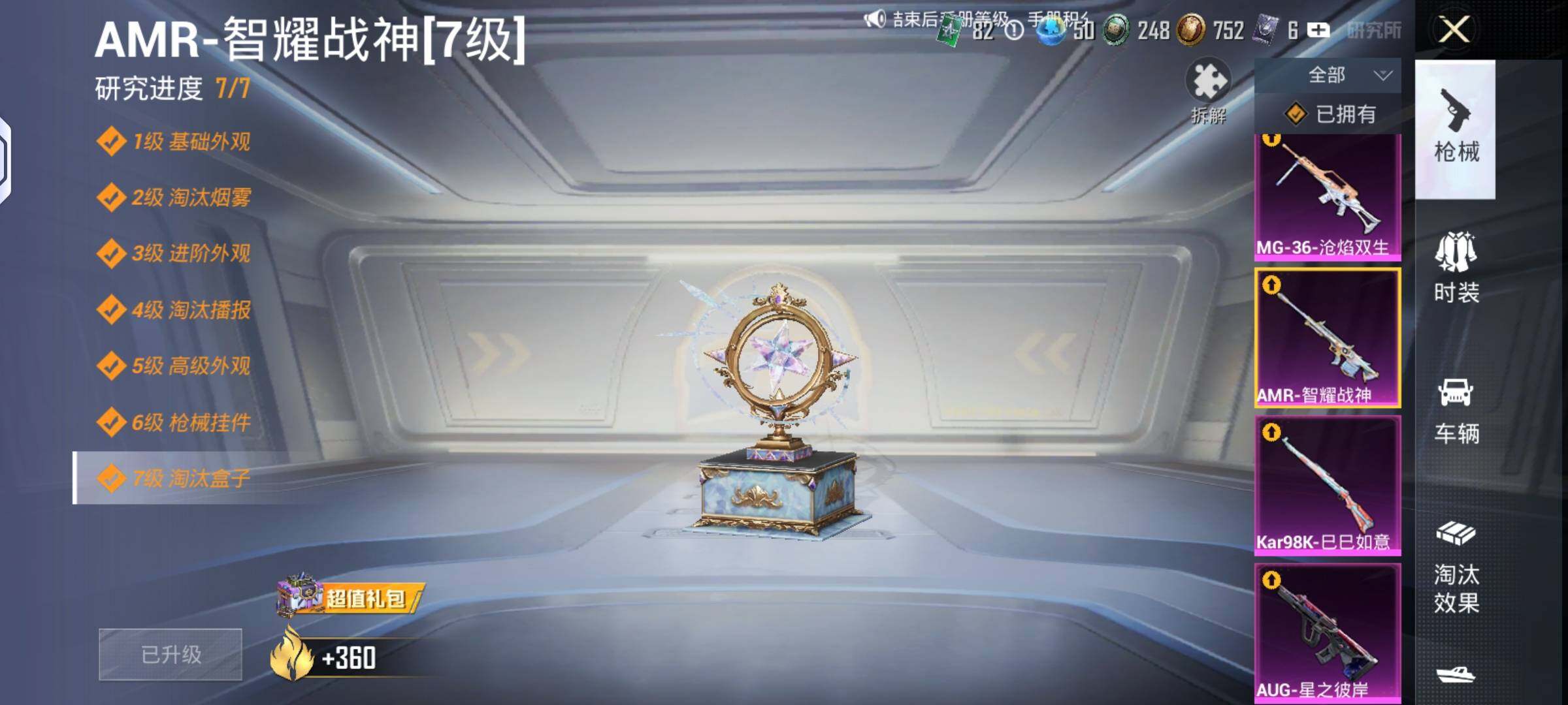 HJ6713 可二 56级 2粉装7特效枪47套装94枪皮 6印记 【2粉装】 幻彩电音 星之彼岸 【7特效枪】 Kar98K-巳巳如意 (2级) MG-36-沧焰双生 (5级) DP-28-豹影疾电 (5级) AMR-智耀战神 (7级) AUG-星之彼岸 (6级) Mk14-福马献瑞 (5级) ACE32-萌骑漫游 (3级)