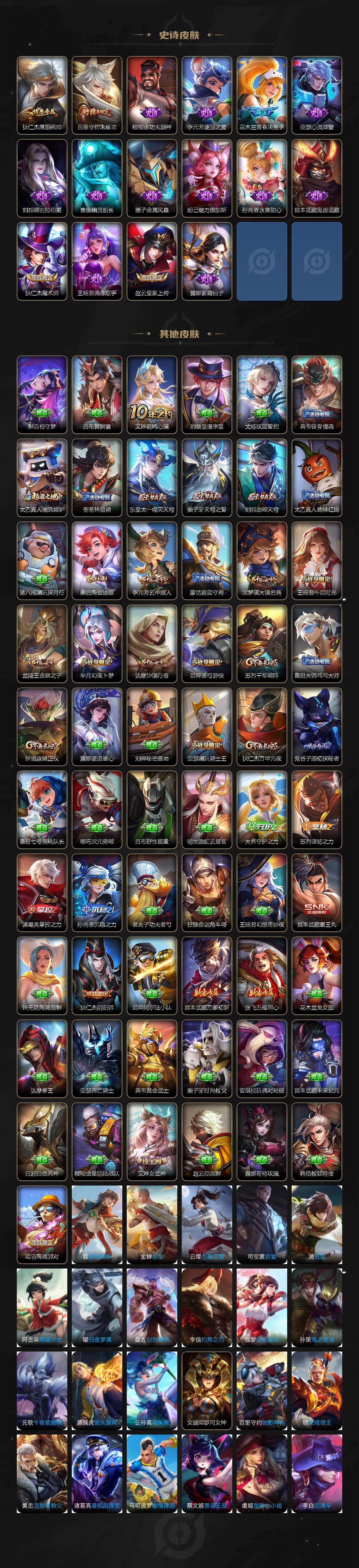 【限定皮肤】:姜子牙天穹之誓,狄仁杰阴阳师,赵云皇家上将,庄周高山流水,芈月幻夜卜梦,元歌云间偶戏,狄仁杰魔术师,狄仁杰万华元夜,达摩沙漠行僧,项羽海滩派对,韩信傲雪梅枪,王昭君午后时光,兰陵王金庭之子,花木兰青春决赛季,亚瑟潮玩骑士王,孙悟空孙行者,后羿圣弓游侠,李元芳